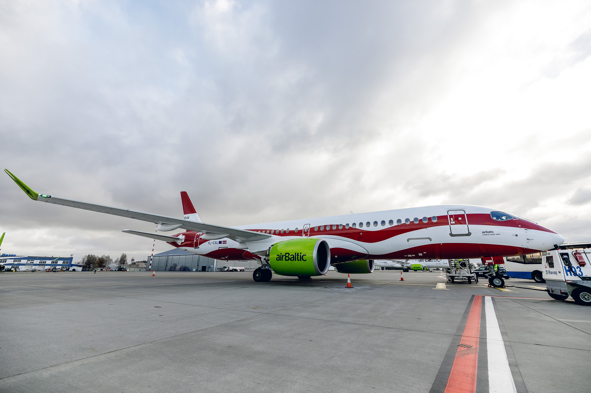В первые в истории авиакомпании самолет airBaltic покрашен как произведение искусства, изображая символ страны – флаг Латвии. Чтобы создать это произведение искусство, 15 профессиональных маляров работали 1000 часов. Всего в процессе крашения было использовано 250 литров грунта, красок и лака, окрашенному слою достигнув толщину 120 микрон или 0,12 мм.