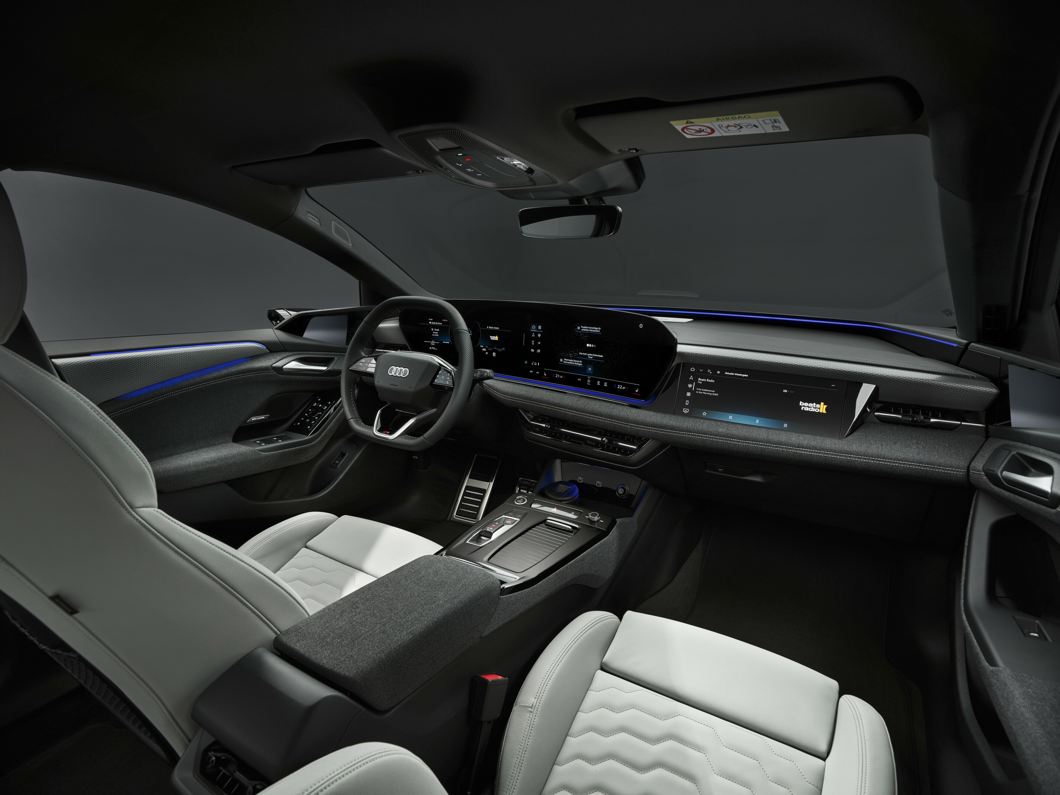 Интерьер Audi A6 e-tron спроектирован с учетом потребностей пользователей. Трехмерный дизайн с высоким контрастом акцентирует внимание на элементах, создавая индивидуальную архитектуру пространства и эргономики для пассажиров. Панорамный дисплей MMI с OLED-технологией включает 11,9-дюймовую виртуальную приборную панель Audi и 14,5-дюймовый сенсорный дисплей MMI. В комбинации с 10,9-дюймовым дисплеем для переднего пассажира, это создает цифровую сцену с четким визуальным дизайном.