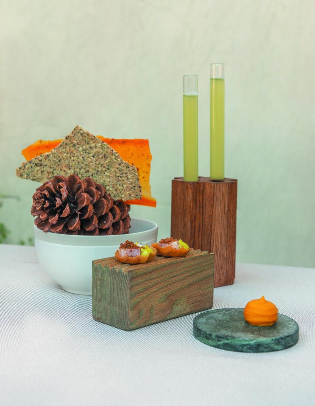Шеф-повар Года Юкнайте-Ламсарге предлагает изысканную интерпретацию традиции: хрустящий вафельный блин с нежной олениной, мятным чимичурри и маринованной айвой.