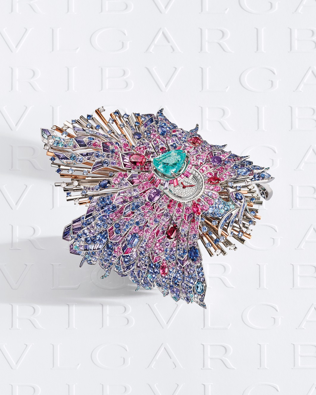 Креативный директор часового подразделения Bvlgari Фабрицио Буонамасса Стильяни стремился прославить вечность в мифическом существе, создав захватывающее дух произведение искусства, изготовление которого потребовало более 3000 часов. Абсолютный шедевр — часы Fenice High-Jewelry — вновь подтверждает статус римского Дома как Мастера цветных драгоценных камней. Bvlgari отобрал более 160 карат потрясающе красивых камней, включая синие, розовые и фиолетовые сапфиры, аметисты, рубины, розовые гранаты, танзаниты, иолиты, аквамарины и бриллианты, чтобы создать невероятный эффект деграде в палитре оттенков от синего и красного до розового и фиолетового. Циферблат скрывает исключительно редкий турмалин Параиба в 9,78 карат. Изящное и дерзкое подвижное оперение обхватывает запястье уникальной ажурной конструкцией, позволяющей птице расправить крылья и взлететь. В этих часах великолепный Феникс окружен шипами, символизирующими свет возрождения, усиливая несравненный блеск творения, вдохновленного алтарем работы Джан Лоренцо Бернини в римской церкви Санта-Мария-делла-Виттория.