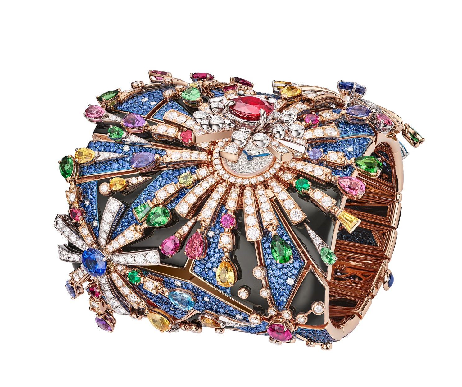 Блеск и утонченность достигают абсолютной гармонии в Fuochi D’Artificio High-Jewelry Manchette, на создание которых ушло более 1450 часов. Эти невероятно драгоценные часы в виде полужесткого манжета из розового золота и синего титана в цвет неба создает контраст с темным ониксом, олицетворяя взрыв ярких фейерверков. Огромное разнообразие цветных драгоценных камней тщательно составлено и скреплено самыми сверкающими бриллиантами и вставками из оникса, ограненными и отполированными вручную. Эта необыкновенная ода радости, которой добавляет выразительности динамизм подвижных элементов.