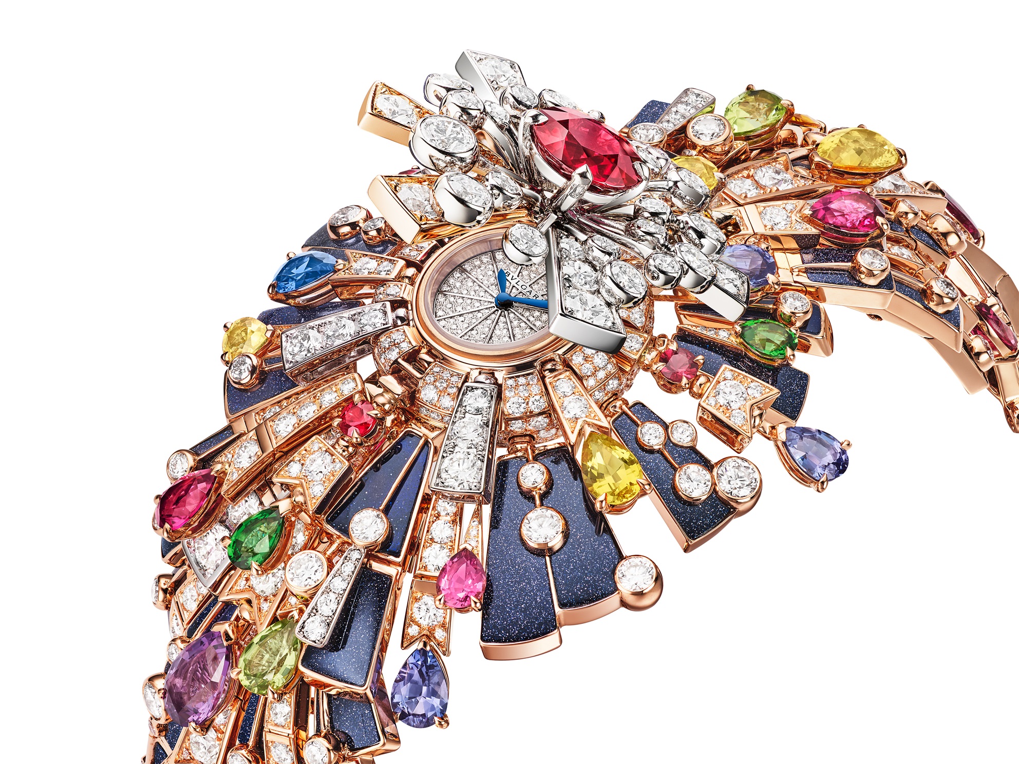В Fuochi D’Artificio Haute Joaillerie Petite, секретных часах с полужестким браслетом, от центрального рубина круглой огранки расходится фейерверк из разноцветных грушевидных драгоценных камней и круглых бриллиантов. Со всей дерзостью Bvlgari сочетает драгоценные камни и вставки из авантюрина — полупрозрачного стекла с блестящими вкраплениями меди, изобретенного в Венеции в 15 веке.