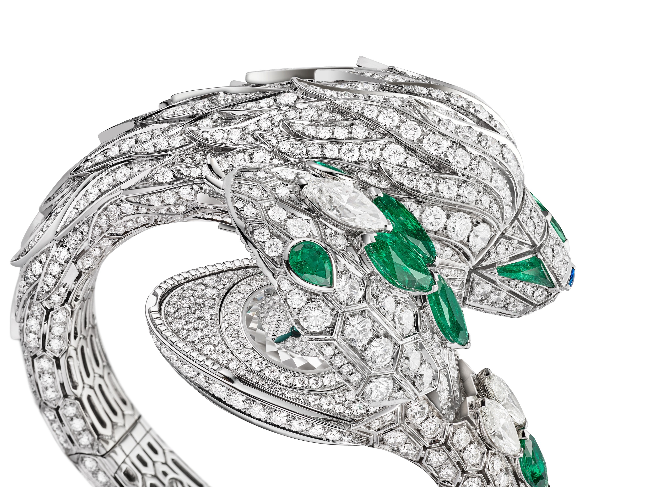 Часы с секретом Serpenti Misteriosi Chimera High-Jewelry secret из белого золота, 4 изумруды огранки «маркиз» (3,24 карат) и 2 бриллианта (2,00 карат), бриллианты круглой огранки (19,78 карат), 2 изумруда грушевидной формы (0,60 карат) и 2 изумруда фантазийной огранки (0,50 карат) в глазах, 1 сапфир фантазийной огранки (0,07 карат). Циферблат, паве из бриллиантов (0,28 карат), зеленые стрелки и фацетированное сапфировое стекло. Микро-калибр Piccolissimo с ручным подзаводом, 30-часовой запас хода.