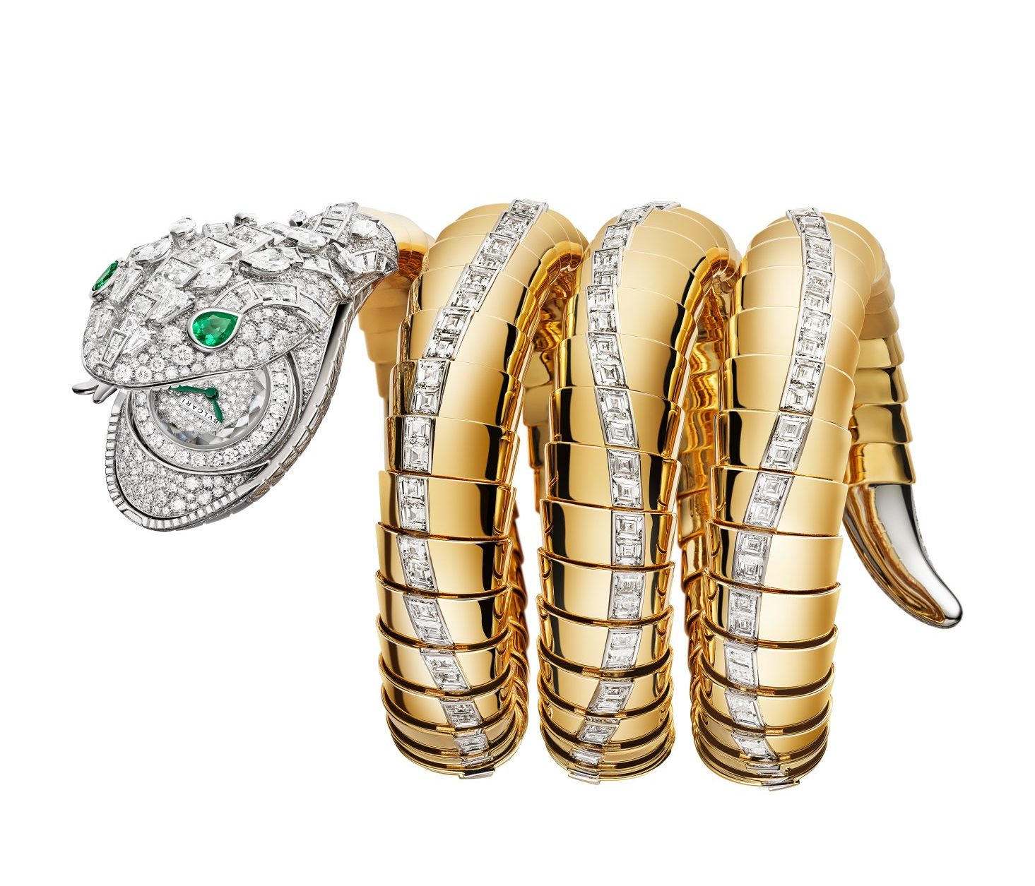 Часы с секретом Serpenti Misteriosi Dragone из белого и желтого золота с бриллиантами огранки «багет» (26,74 карат), «маркиз» (1,28 карат), круглой огранки (2,88 карат) и 2 изумрудами грушевидной формы (0,49 карат) в глазах, браслет в три витка. Циферблат, паве из бриллиантов (0,28 карат), зеленые стрелки и фацетированное сапфировое стекло. Микро-калибр Piccolissimo с ручным подзаводом, 30-часовой запас хода.