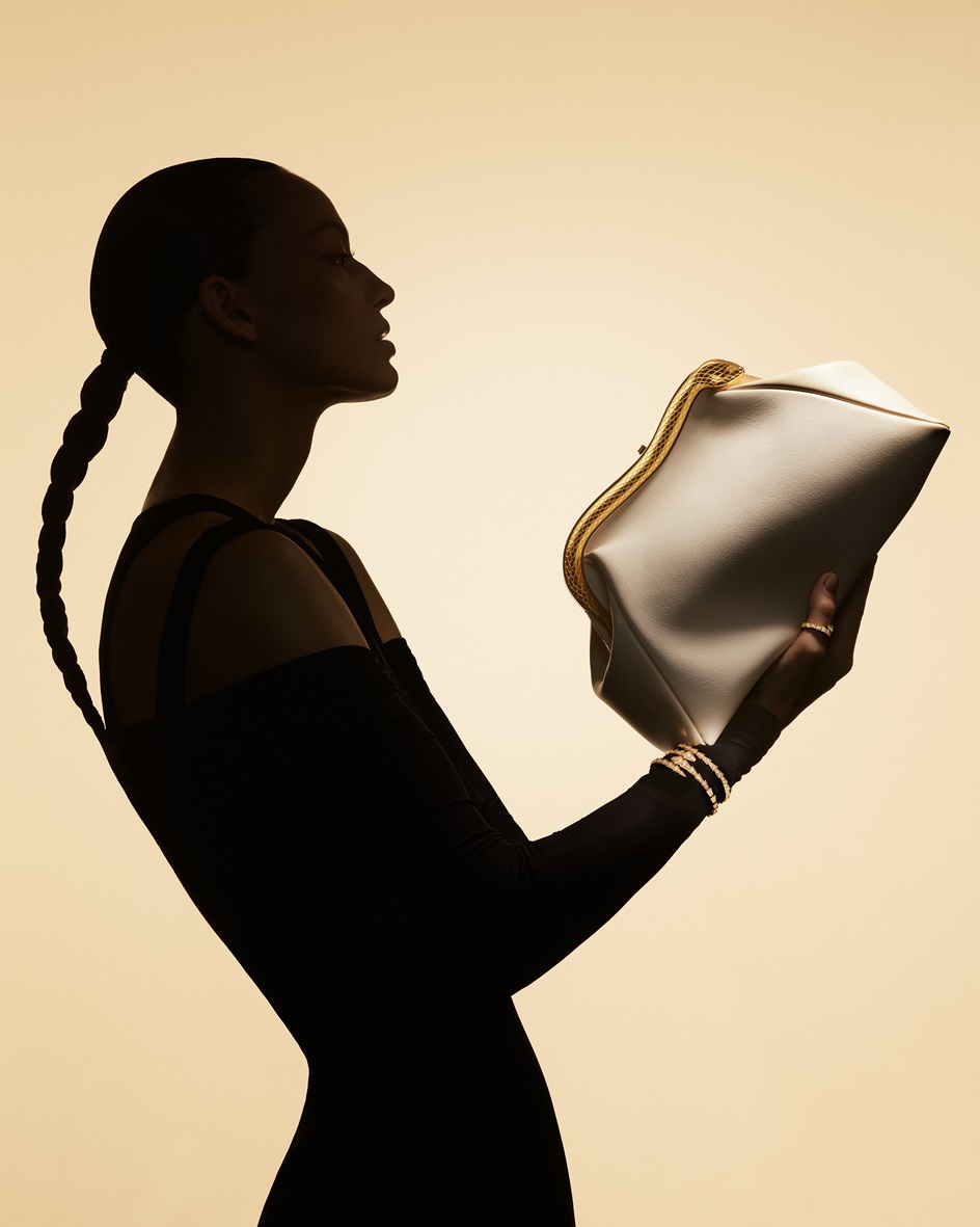 Та же изобретательность нашла отражение и в мире аксессуаров: абстрактный змеиный мотив появился на культовой вечерней сумке Melone, придав коллекции новое звучание.
