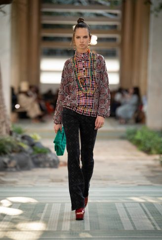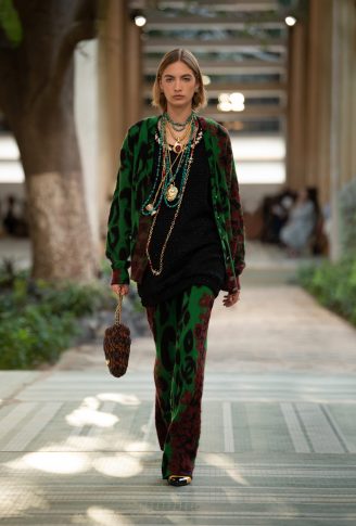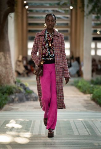 Обилие растительных мотивов, линий и геометрических фигур, изобилие теплых тонов, блесток и сверкающие подвески в сочетании с утонченным кружевом: изысканное очарование CHANEL – Dakar 2022/23. Коллекция Métiers d’art представлена длинными приталенными пальто, узкими расклешенными брюками, воротниками в стиле семидесятых, в коллекции туфли на платформе, толстовки оверсайз, пестрые и расшитые цветами, разноцветный твид и платья, которые короче спереди, чем сзади. Дух семидесятых пронизывает всю коллекцию. Десятилетие поп-соул-фанк-диско-панк с его завораживающей свободой, символизируемой взрывом энергии.