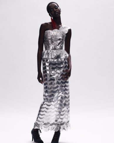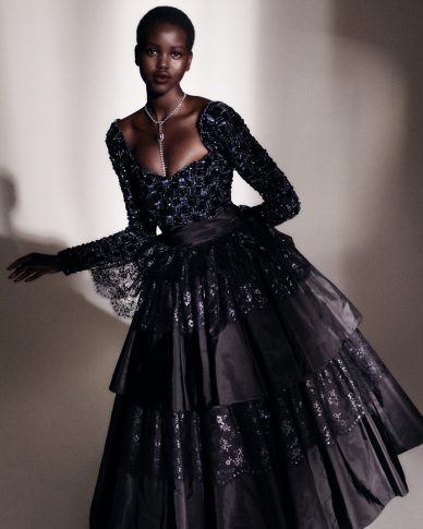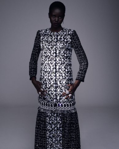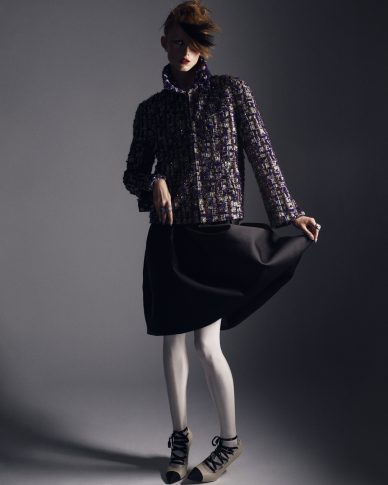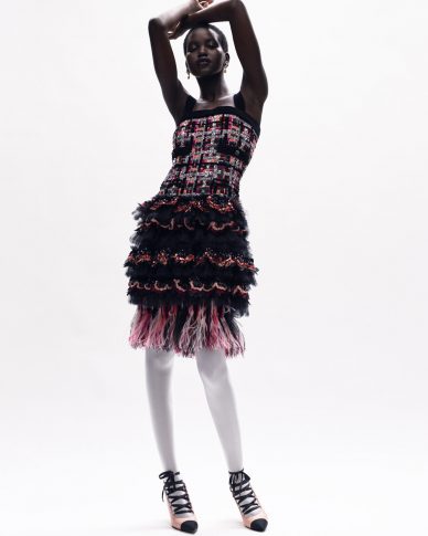 Все партнеры CHANEL по вышивке, включая Métiers d’art Lesage и Montex, а также Lemarié и Goossens, внесли свой вклад в драгоценные твиды, расшитые пайетками, стразами, камнями и бисером. «Алмазоподобное» плетение украшает черные брюки. Короткие платья с завышенными талиями и юбки-венчики выходят на подиум вместе с длинными платьями, больше характерными для благородных героинь с картин 19-го века.