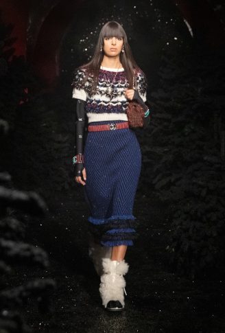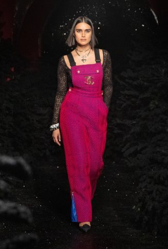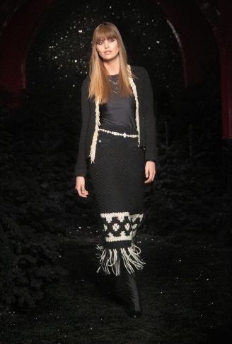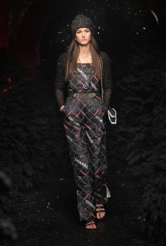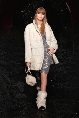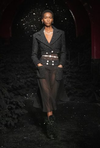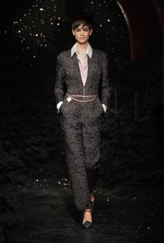 «Итак, я выбрала замок. Мне нравится замок за его многочисленные салоны, винтовую лестницу, бар, путешествие по этому месту, его стиль маленького домика, где модели могут переодеваться, одеваться и раздеваться, вместе делать макияж и веселиться, как ночь для девочек. Это очень чувственно». Контрасты между объемами, материалами и духом. Длинное твидовое пальто с узором шеврон открывает обнаженные ноги в объемных ботинках из черного вьющегося искусственного меха; брючный костюм из черного твида с мелкой клеткой из синего люрекса украшен тонкими подтяжками из жемчуга и слоями ожерелий. Белое пальто из лакированной овчины на подкладке из искусственного меха сочетается с двухцветными ботинками в стиле «пуховик», уступающими место паре серебряных ботинок на каблуке, в которых можно танцевать. Комбинезоны-комбинезоны из белого стеганого шитья. Вышитые красными и синими мотивами или из твида цвета фуксии, носятся с босоножками с ремешками, украшенными цепочками, и маленькими черными бантами или туфлями, украшенными камелией, а нежные блузки из шифона или крепдешина сочетаются с предметами, вдохновленными зимними спортивными костюмами.