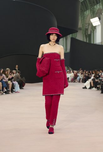 Коллекция исследует и многослойность: твидовый костюм в оттенке гренадина включает мини-жакет на красной шелковой подкладке, юбку-запах и расклешенные брюки. Другой ансамбль в бронзовых тонах сочетает тунику, брюки и застегнутую сверху юбку. Третий образ объединяет жилет-бомбер без рукавов и длинную юбку с разрезом, поверх которой надета мини-юбка.