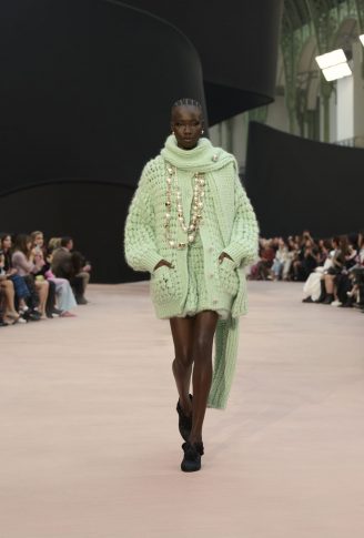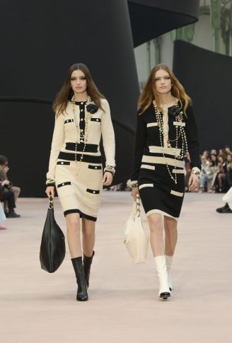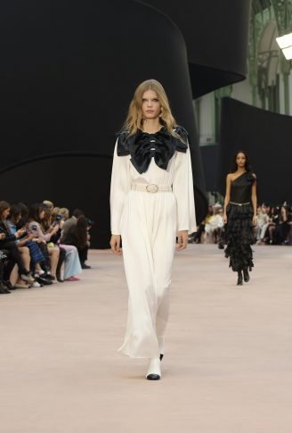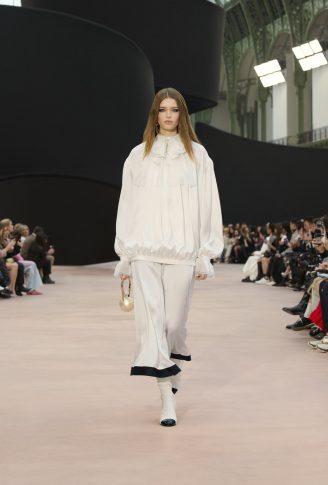 Бант, лента, жемчуг, цветок… Коллекция переосмысляет знаковые символы CHANEL, играя с размерами и фактурой. Банты украшают воротники и манжеты блуз и платьев, каскадом спускаются по ожерельям, появляются даже на пуховике и спортивных брюках. Длинная белая трикотажная лента обвивает черный свитер и заканчивается крупным бантом на плече. Другие объемные или ажурные банты подчеркивают платья, кардиганы и свитеры.