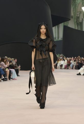 Тонкость исполнения проявляется в шифоновых джинсах, шелке с фактурой твида, принтах в виде лент, развевающихся на ветру, и парке с капюшоном из черного органзы, украшенной бантами. Женственность подчеркивают ботильоны-носки и атласные туфли с драпировкой вдоль стопы.