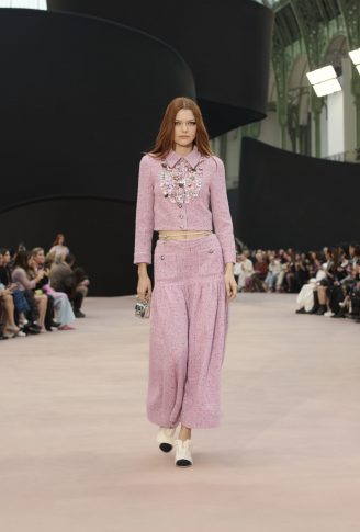 Миниатюрный жакет из твида в сине-розово-белой гамме сочетается с удлиненными брюками, а объемная рубашка из поплина спускается до щиколоток. Классический черный твидовый жакет с отделкой превращается в элегантное пальто-платье с ювелирными пуговицами, а накидка завершается манжетами, как у пиджака.