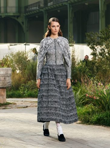 Именно этот принцип и составил основу коллекции: парадокс между строгостью костюма и утонченностью твида, между мужским и женским, между черным и белым.