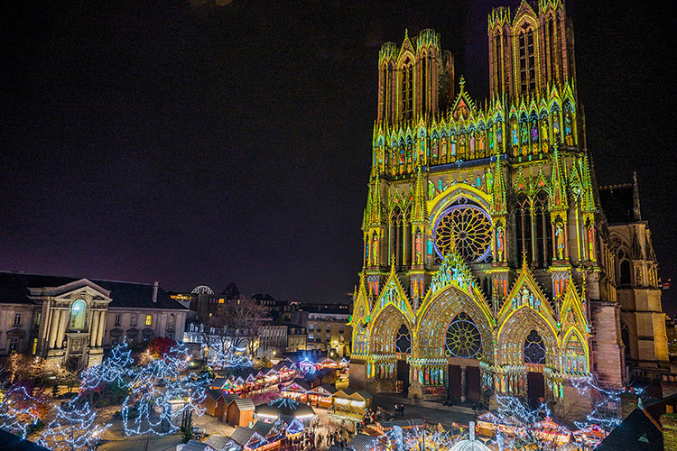 Рождественская ярмарка в Реймсе — одна из самых популярных во Франции благодаря сочетанию традиционных угощений, красивой архитектуры и яркого вечернего шоу. Главный акцент — световая проекция Rêve de Couleurs, которая оживляет фасад готического собора под музыкальное сопровождение. Гости города традиционно смотрят представление с бокалом шампанского: регион Шампань — историческая родина этого напитка, и дегустация здесь становится частью опыта.