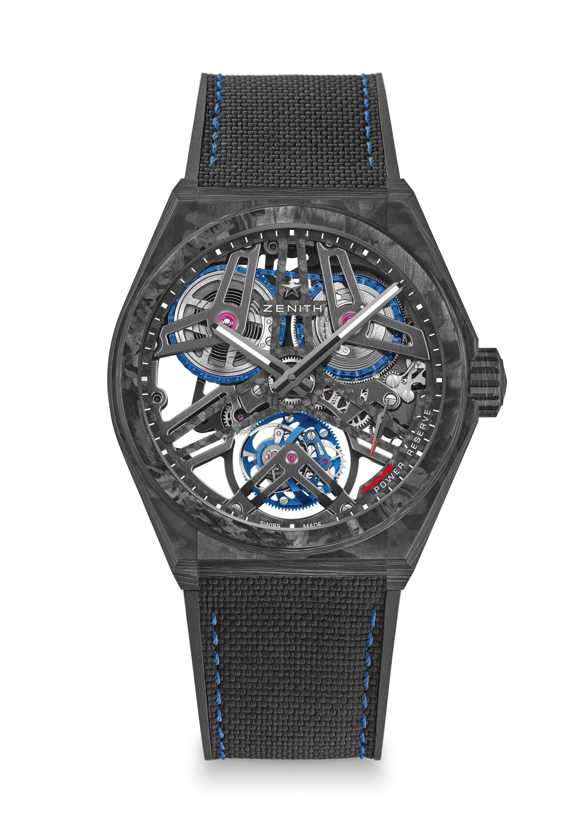 Первая версия выпускается в легком, но прочном корпусе из углеволокна, с заводной головкой и застежкой ремешка, изготовленными из этого же материала. Отделка из углеволокна присутствует даже на открытом циферблате, на котором центральный скелетонированный элемент и ободок акцентируют внимание на уникальном мерцании углеволокна. Выдержанные в стиле хай-тек часы DEFY Fusee Tourbillon из ZENITH из углеволокна оснащены черным каучуковым ремешком с кордурным эффектом и синей прострочкой. Также к ним прилагается второй ремешок, выполненный из черного каучука с эффектом плетения из углеволокна. Часы DEFY Fusee Tourbillon из углеволокна выпускаются ограниченной серией из 50 экземпляров.