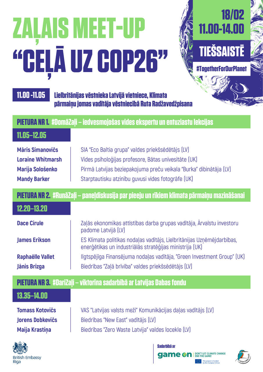 В преддверии 26-й Конференции ООН по изменению климата «COP26», которая состоится в ноябре этого года в Великобритании, посольство Великобритании в Латвии 18 февраля организует первую зеленую онлайн-встречу «На пути к COP26», на которой латвийские и британские эксперты и энтузиасты в сфере экологии будут обсуждать темы изменения климата, возможности стран по снижению воздействия на окружающую среду, а также внедрения устойчивых привычек в обществе.