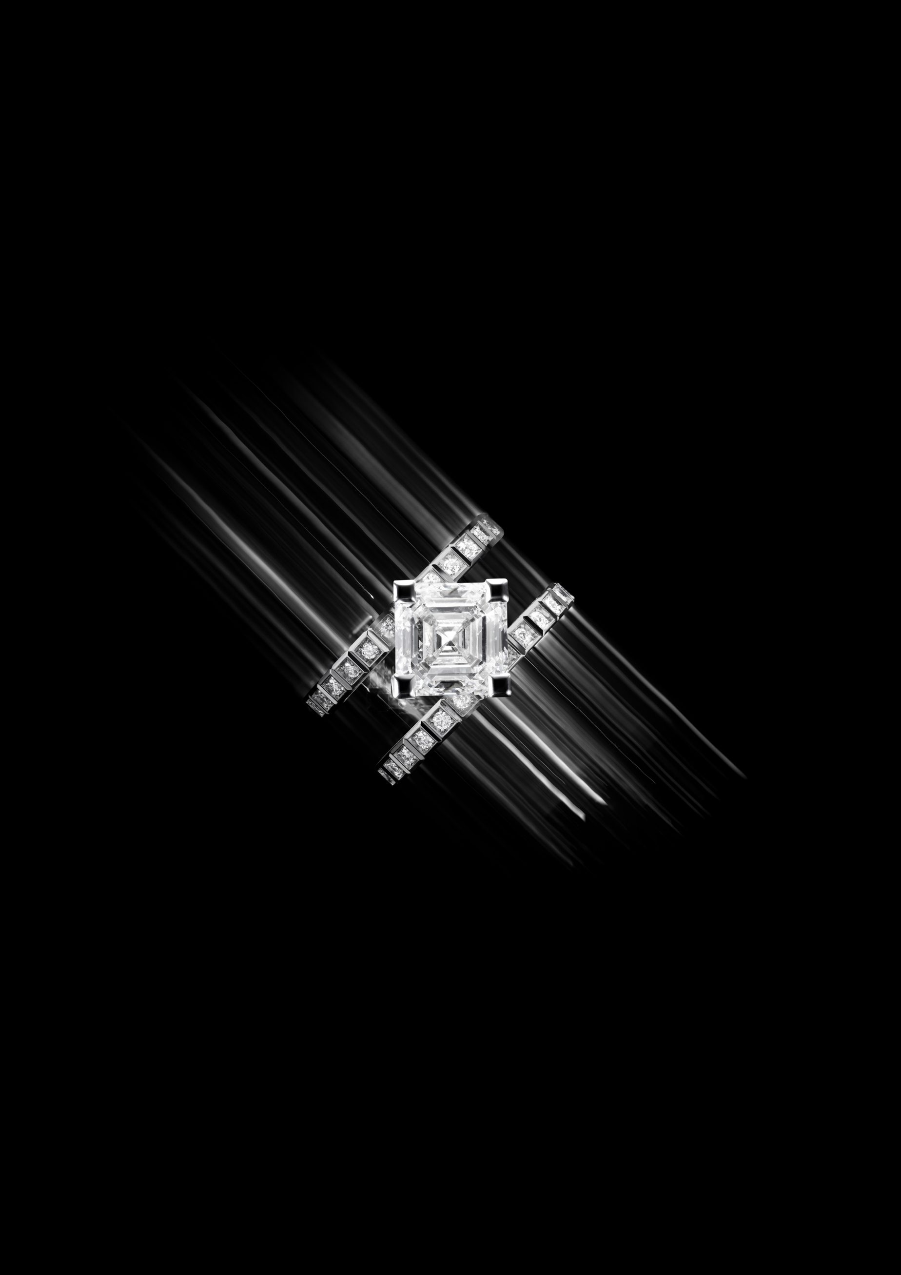 Знаковый для ар-деко изумительный огран Asscher получает новое воплощение в двух произведениях. Кольцо повторяет культовую многополосную форму коллекции, акцентированную 3-каратным бриллиантом огранки Asscher, установленным по диагонали между двумя параллельными полосами из белого золота 18 карат с бриллиантовым паве.