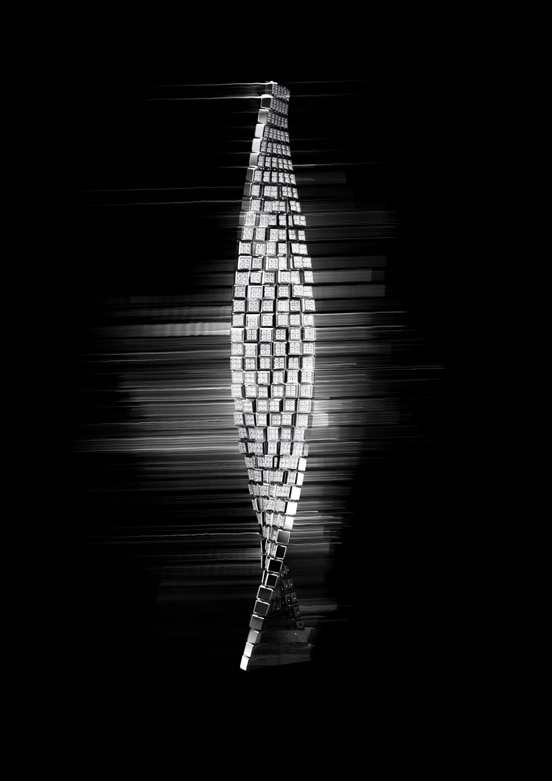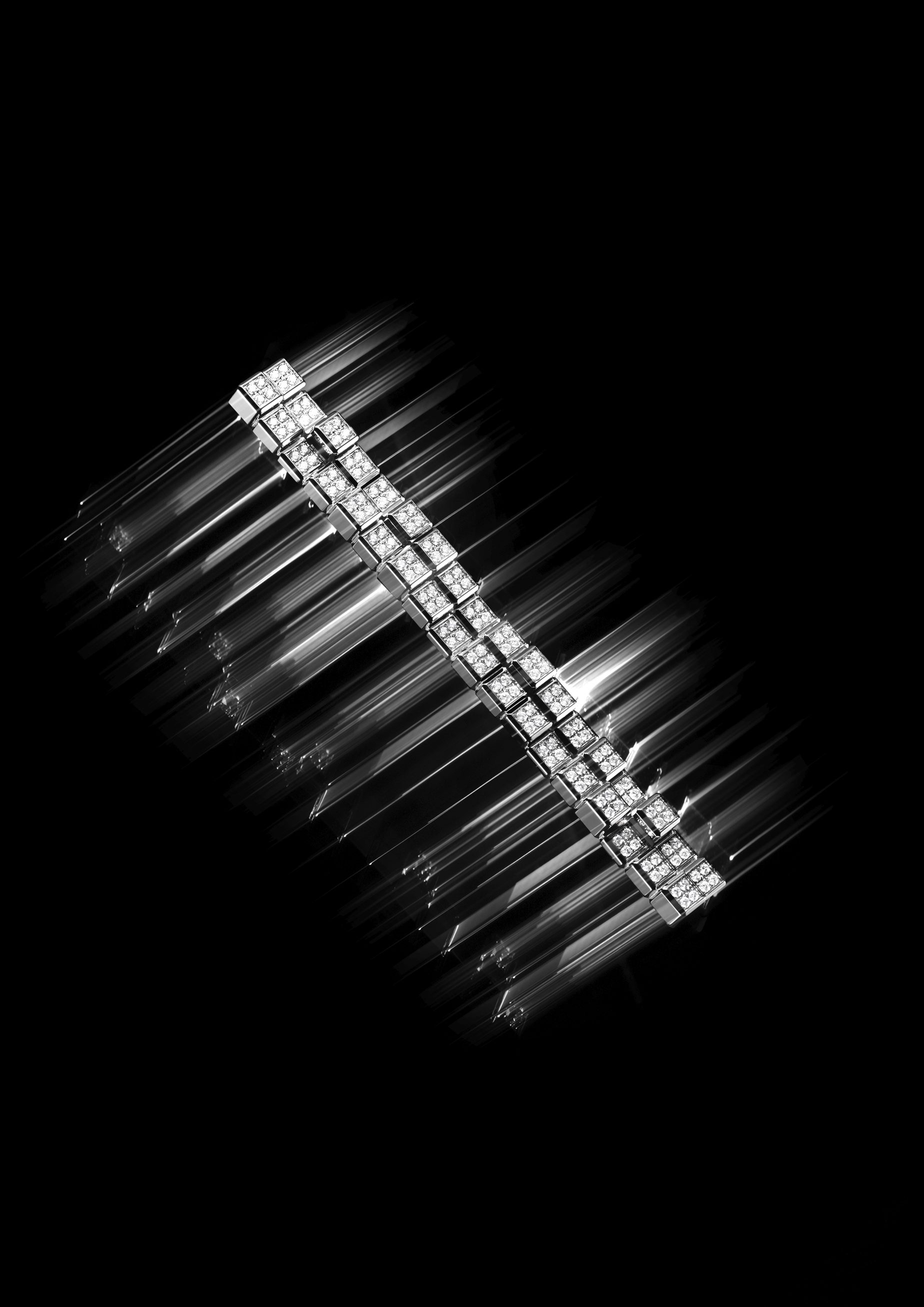 Браслеты и многофункциональная брошь отражают архитектурные коды коллекции через кубы разной высоты – словно очертания небоскрёбов, сверкающих на рассвете. Их зеркальные поверхности сияют, как окна, залитые солнцем. Этот эффект требует высочайшего мастерства: полировка неровных поверхностей – редкий навык, доступный лишь единицам, а ещё реже – внутри собственного ателье.