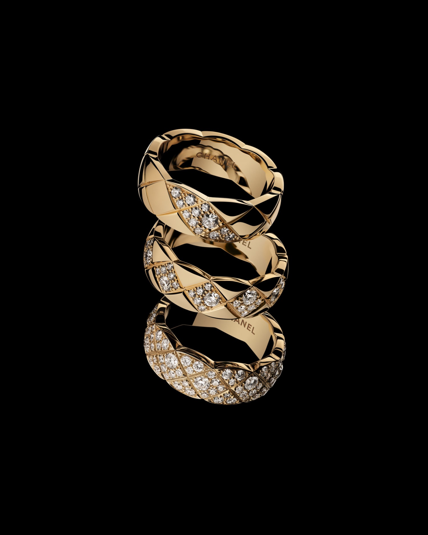 С годами COCO CRUSH расширила своё предложение, добавив драгоценные украшения с алмазной инкрустацией — это самая эксклюзивная версия коллекции, полностью покрытая бриллиантами. Искрящиеся камни подчёркивают изогнутый стеганый узор, усиливая ритм и геометрию линий.