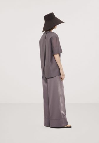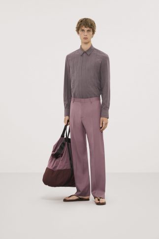 В мужской коллекции вдохновение сезона транслируется через адаптированную текучесть, находящую отражение в шерстяных брюках с боковыми складками, которые раскрываются при ходьбе, что позволяет делать шаг легко и непринужденно.