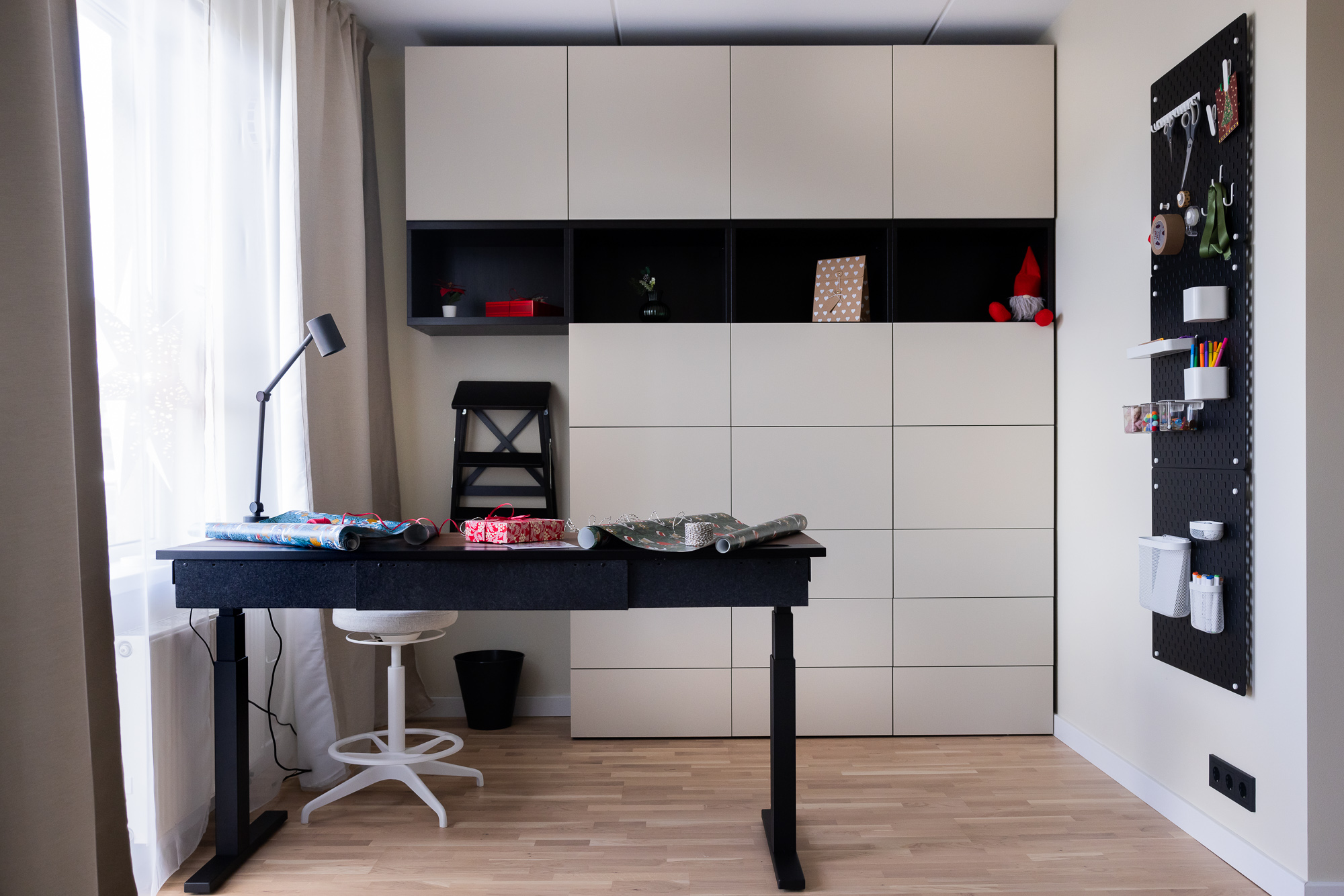 «В рабочей зоне я выбрала большой стеллаж с тёмной рамой и фасадами в бежевом цвете. Для придания ему визуальной лёгкости я оставила центральную часть открытой, без дверей. Это создаёт стильный контраст, который «разбивает» конструкцию, делает её визуально легче и добавляет динамику пространству, сохраняя при этом лаконичность», — отмечает дизайнер интерьеров IKEA Агнесе Матвейя.