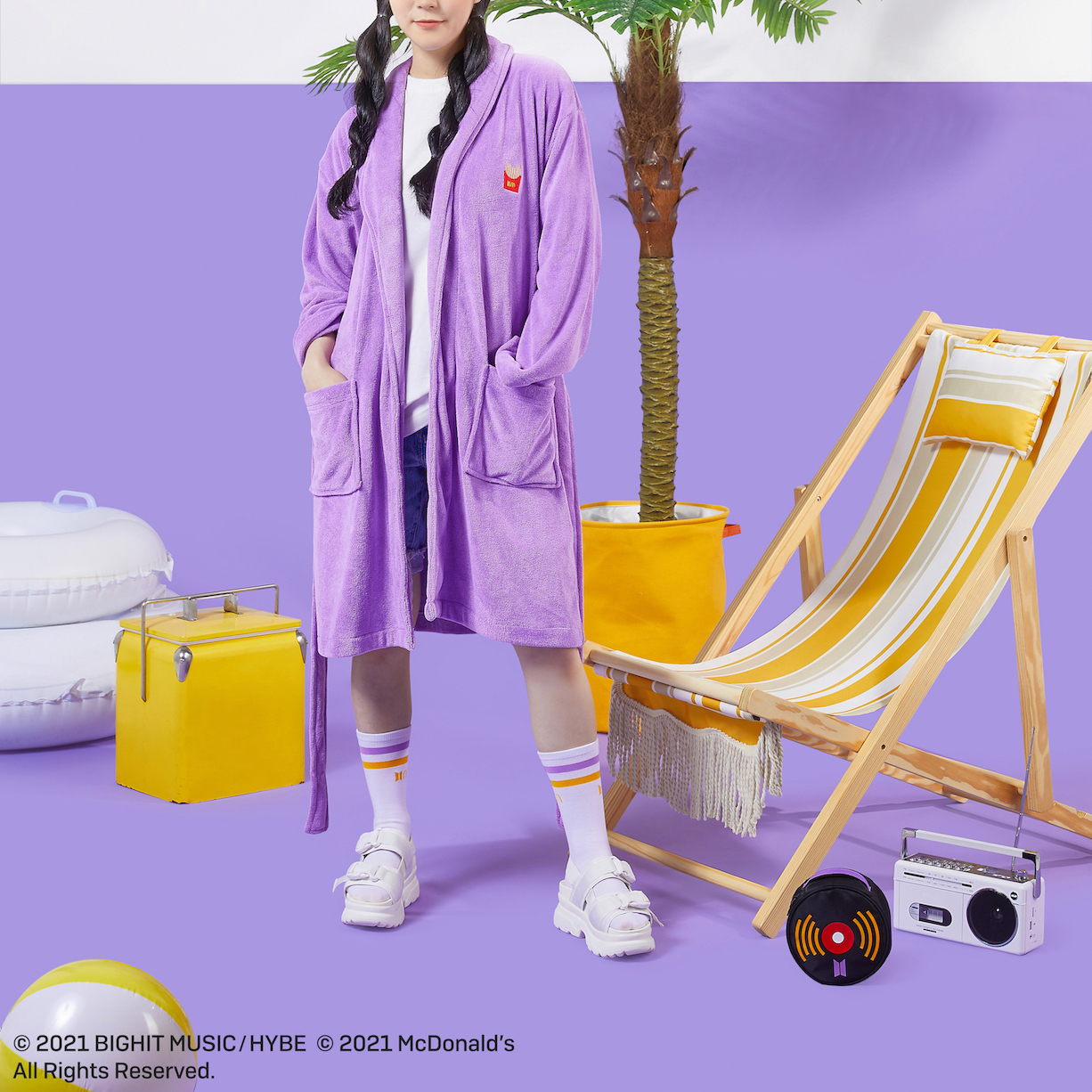 Вдобавок к специальному набору предлагается еще один способ, как отпраздновать это долгожданное сотрудничество – в приложении Weverse Shop McDonald’s и BTS начинают продажу специальной линейки товаров. Коллекция одежды вдохновлена некоторыми из самых желанных и особенных продуктов из комплекта BTS, и у покупателей будет возможность купить такие предметы одежды, как худи (свитера с капюшоном), халаты, носки и сандалии фиолетового цвета. Будь то логотип пакетика для картошки фри McDonald’s с семью палочками картофеля для каждого участника группы BTS или сочетание фиолетового цвета BTS с красным и золотым цветами McDonald’s, эти дизайны превосходно отражают партнерство между двумя брендами, которые так любят их поклонники. Для того, чтобы приобрести коллекцию одежды, необходимо скачать приложение Weverse Shop и создать профиль пользователя.