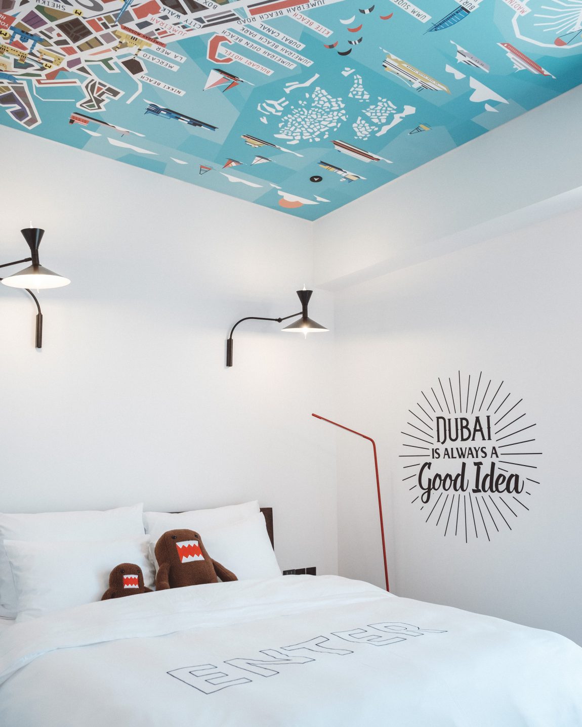 Эргономичная планировка создает свободное и светлое пространство в 150 номерах площадью 23 кв. м – например, вместо тяжелого гардероба стоит компактный рейл, а зеркало в полный рост находится на раздвижной двери в ванную комнату с тропическим душем. К услугам гостей — мини-планшет для управления номером, кофемашина Nespresso, Smart TV и быстрый Wi-Fi. Оригинальные дизайнерские детали, такие как мини-холодильник Smeg красного цвета, красочная поп-арт карта Дубая над мягкой кроватью, полотенцесушитель в ванной, сделанный из приборной панели усилителя звука из 70-х, а также светильник, подвешенный на рыболовный крючок, превращают номера Pocket в модные городские квартиры, где в то же время не нужно самому заправлять постель. А надпись на стене Dubai is Always A Good Idea – прекрасное начало для Stories о путешествии в Дубай в Instagram.