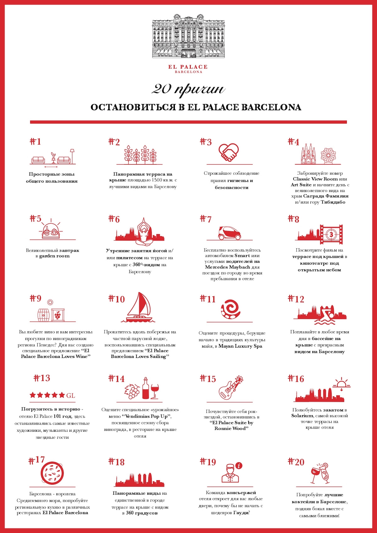 Сегодня мы также хотим рассказать о специальном предложении от отеля, включающим книгу-путеводитель с рекомендациями местных жителей, и поделиться рецептом коктейля от команды Bluesman Cocktail Bar. А в конце рассылки вы узнаете 20 причин, почему в Барселоне стоит остановиться именно в El Palace.