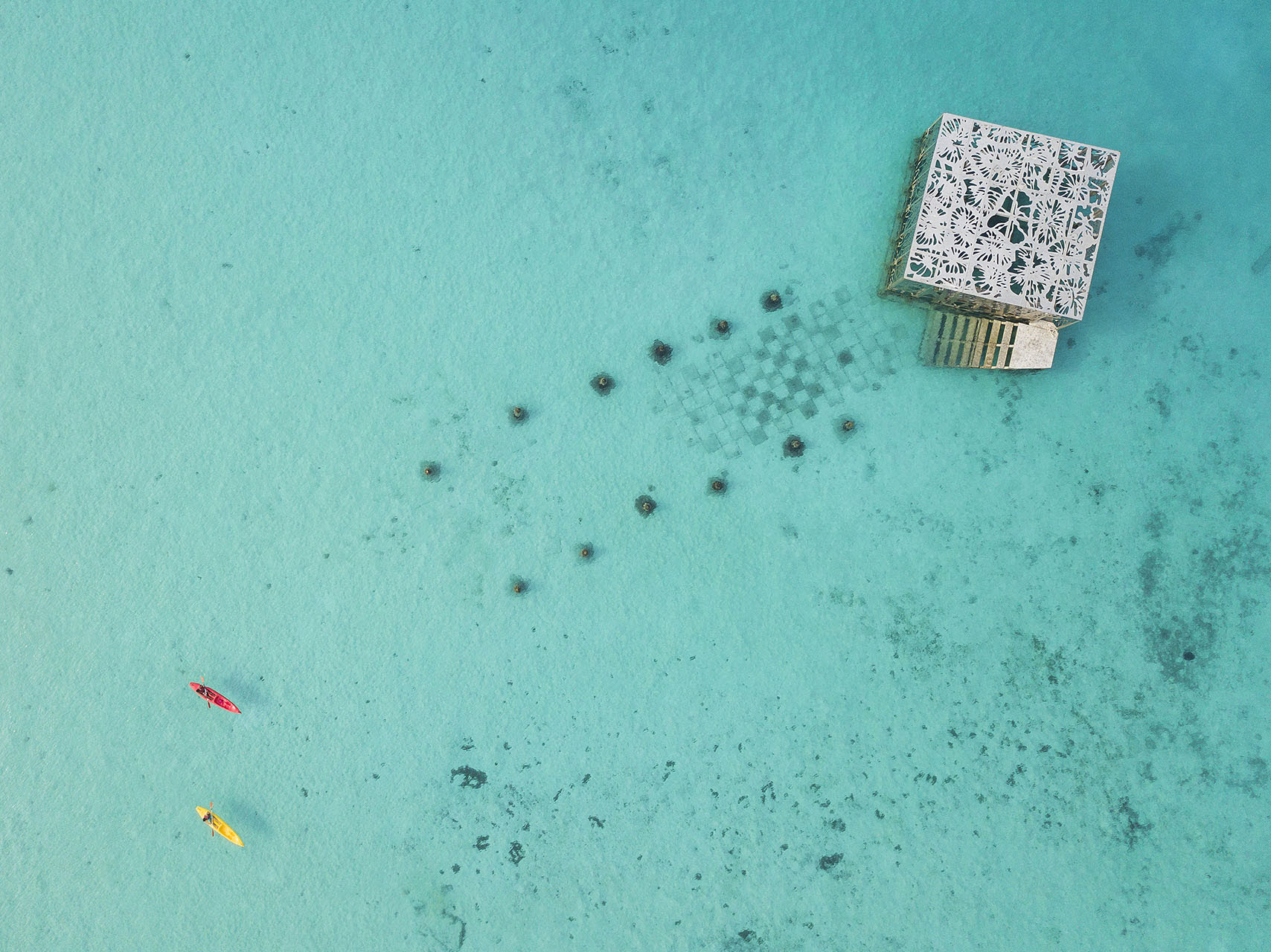Отправная точка для путешествия в “Коралариум” — двухсотметровый Инфинити бассейн, пересекающий остров ровно посередине. Он по праву считается самым длинным на Мальдивских островах. Чтобы добраться до музея, достаточно проплыть всего 50 метров с маской и ластами по особой подводной тропе. Она обозначена шестью коралловыми деревьями, полностью погруженными под воду. Идея заключалась в том, чтобы арт-инсталляция и путь к ней стали своеобразным продолжением Инфинити бассейна. Подводная дорога словно соединяет музей с островом.