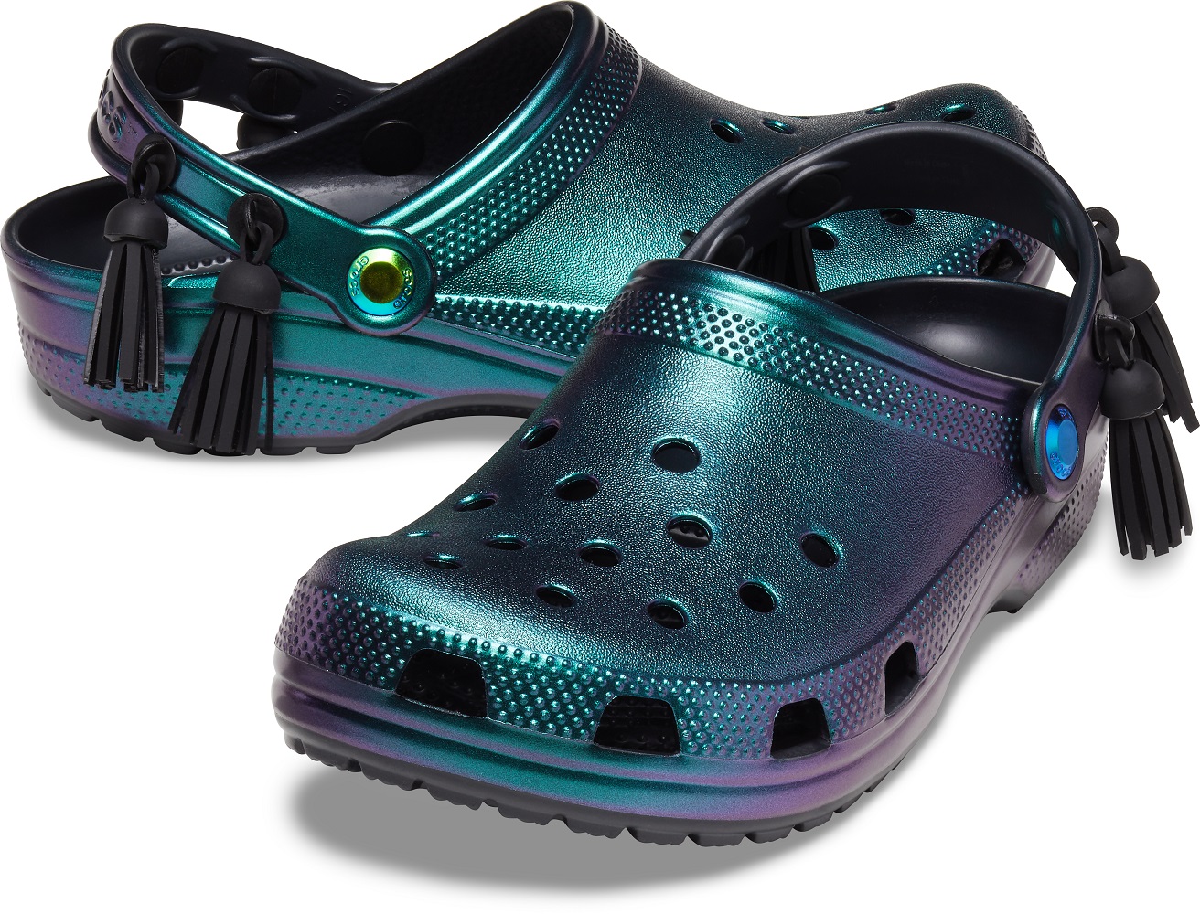 С последним поможет новая фестивальная коллекция Crocs: обувь любимых силуэтов – классические сабо, сабо на платформе и шлепанцы – украшены кисточками и доступны в уникальных цветах – хамелеон и перламутр.