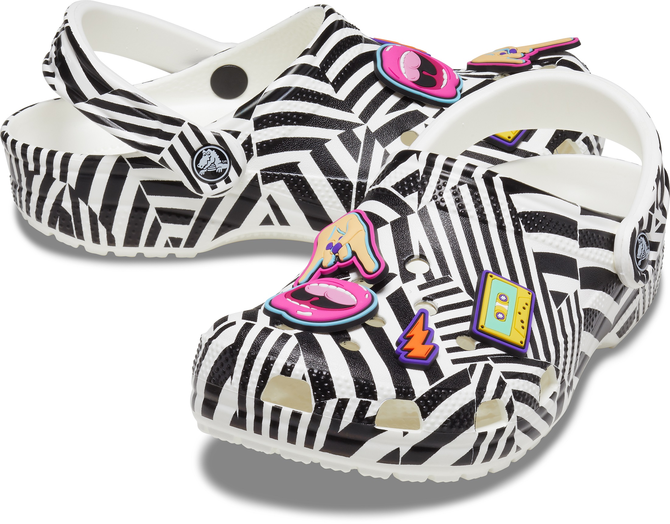 А для тех, кто влюблен в рок-музыку 90-х, бренд создал по-настоящему драйвовые сабо в черно-белом и электрическом розовом цвете. К каждой паре прикреплены эксклюзивные джиббитсы, которые дополнят образ в стиле диско!