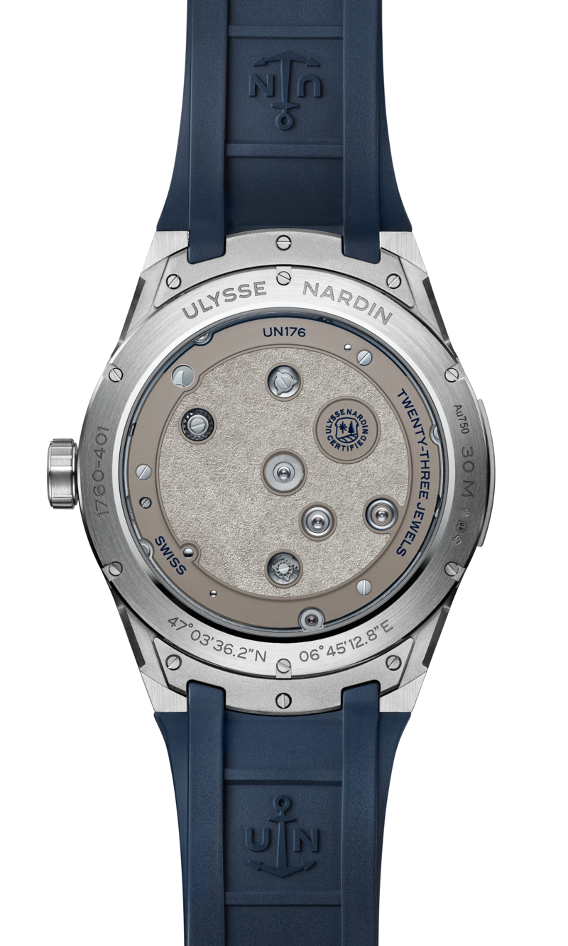 Обратная сторона часов тоже открыта: прозрачная задняя крышка из сапфира демонстрирует платину maillechort, финальный штрих механического совершенства. Вся модель собрана вручную на мануфактуре Ulysse Nardin в Ле-Локле. И это не метафора. Механизм UN-176 — результат двух лет разработки: 246 деталей, 23 камня, 2,5 герца. Каждая деталь — инженерное высказывание.