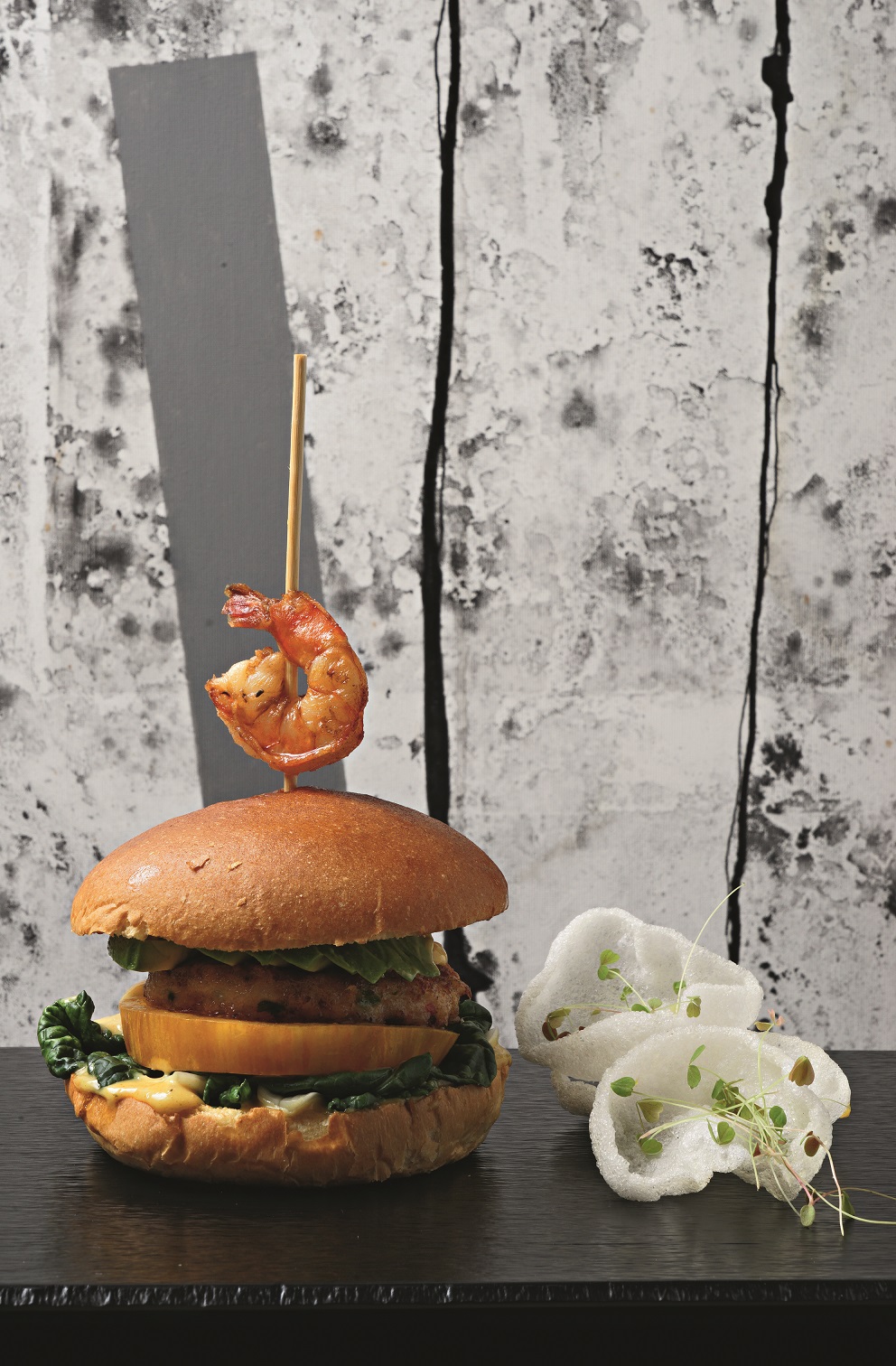 При подаче булочку-бриошь разрезать пополам и положить срезами вниз на сухую горячую сковороду на 1 минуту, чтобы булочка стала хрустящей. Обе части срезов булочки смазать 1 ч. л. соуса айоли. На нижнюю часть выложить лист салата пак-чой, сверху — котлету, затем слайсы авокадо, один-два ломтика помидора и накрыть верхней частью булочки. Можно украсить жареной креветкой.