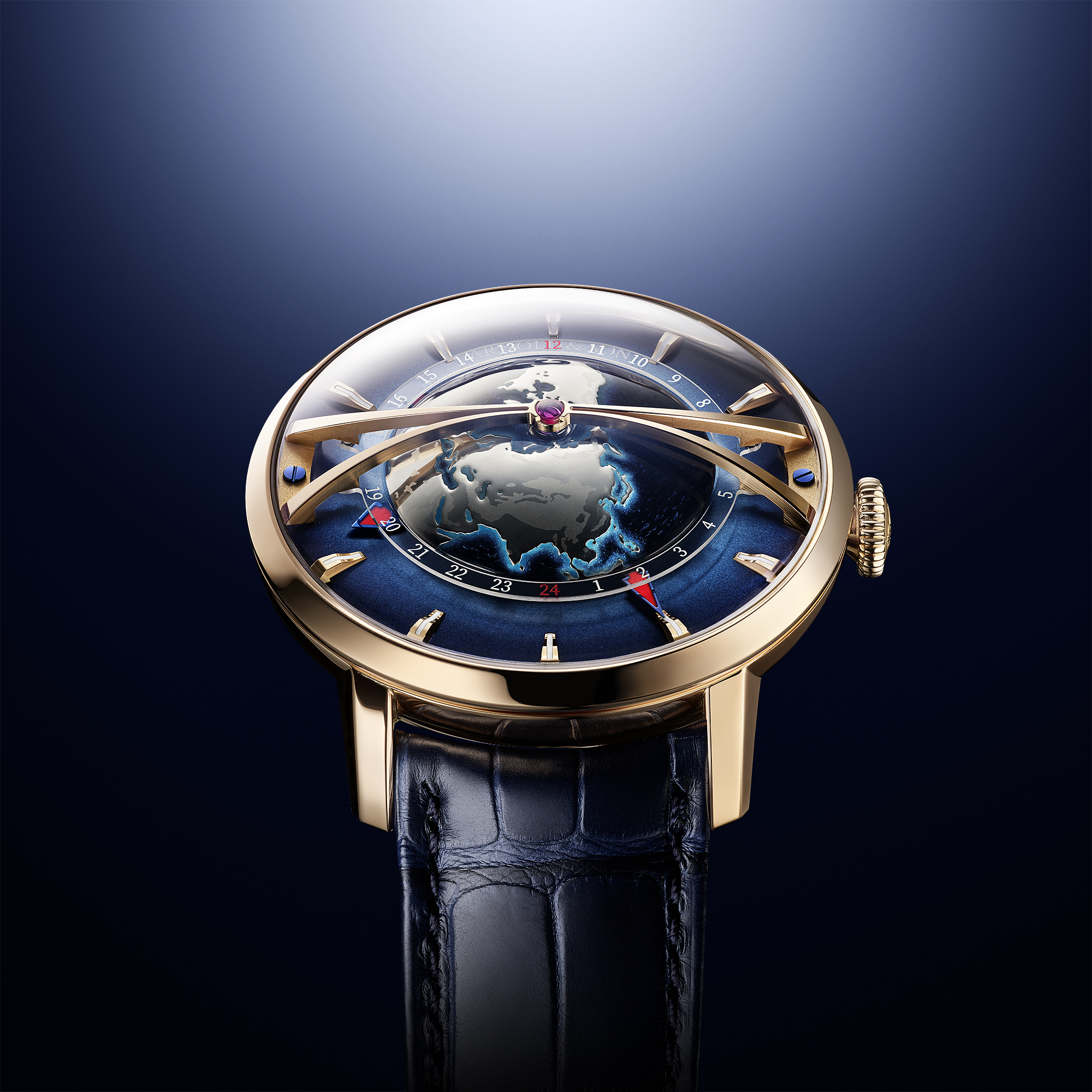 Часы Globetrotter Gold, созданные Arnold & Son , подобно искусному атласу, олицетворяют нашу планету. Выступающий рельеф суши и глубокие, расписанные вручную моря служат фоном для индикации двух часовых поясов с функцией мирового времени. Над Землей нависает бесконечная арка, фиксирующая вращение. Синим градиентом Arnold & Son отдает дань уважения морским хронометрам Джона Арнольда, использовавшимся на английских военно-морских судах в XVIII веке.