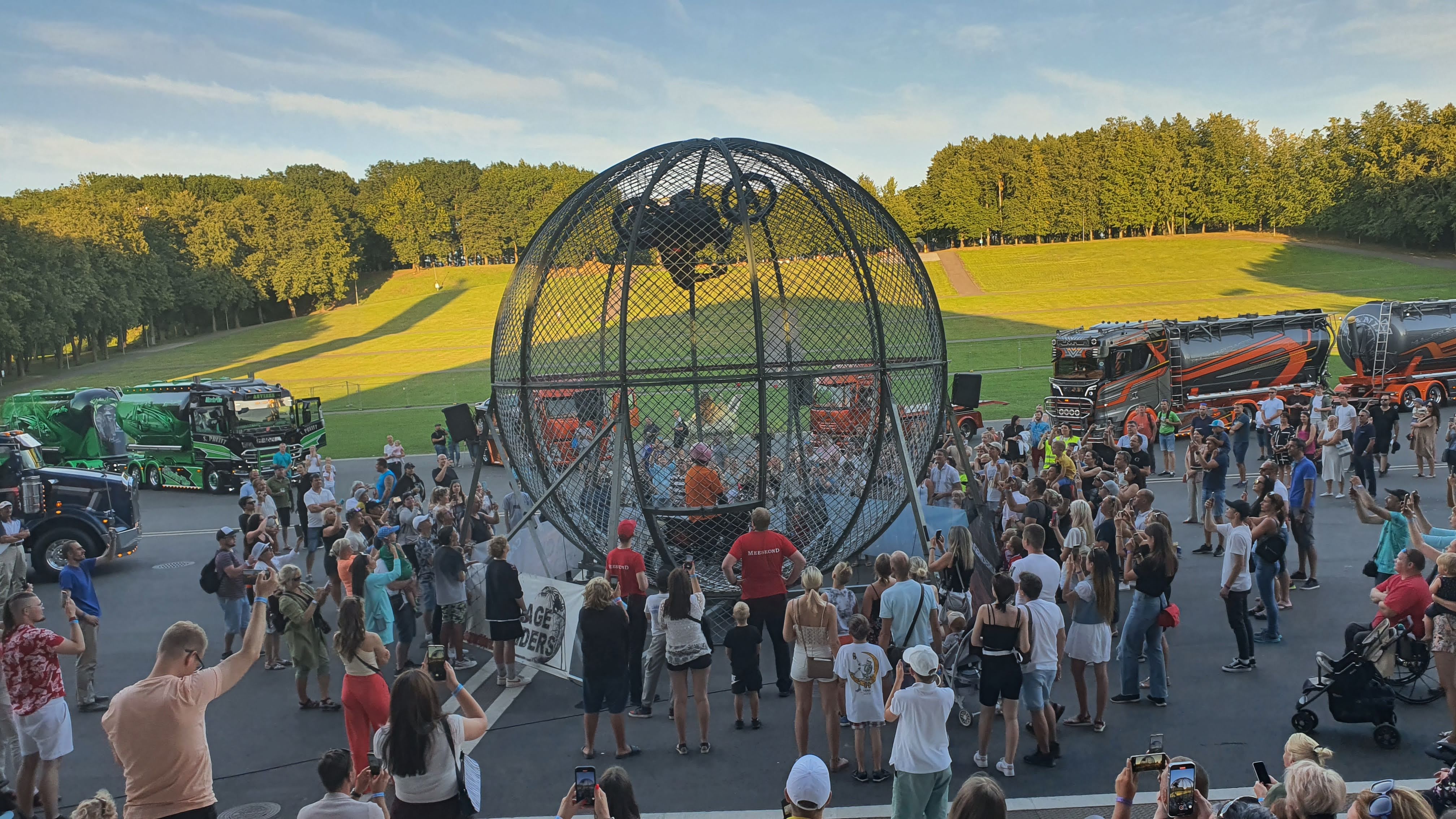 Команда “Cageriders” – два финских мотогонщика Ярно Каранто и Сасья Лаайоки на огромной скорости будут кружить внутри Death Drive Ball, или “шара смерти”, установленного на Кипсале рядом с экспозицией “Auto Exotica”. Металлическая сфера диаметром шесть метров и весом в три тонны состоит из 24 частей и будет доставлена в Ригу на грузовом автомобиле. Конструкцию скрепляют 300 болтов, ее сборка займет более восьми часов.