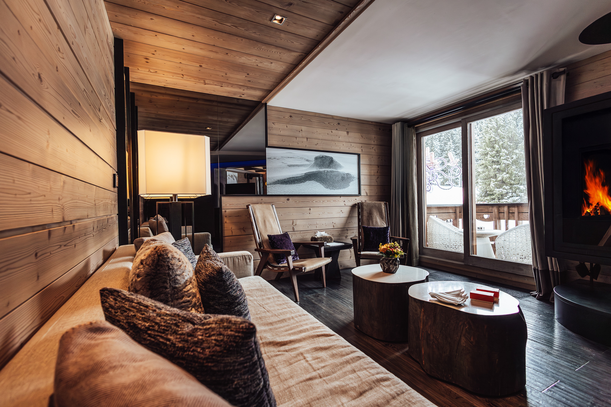 - Интерьеры в современном альпийском стиле: натуральное дерево, камень, мех, камины и уют в каждой детали.