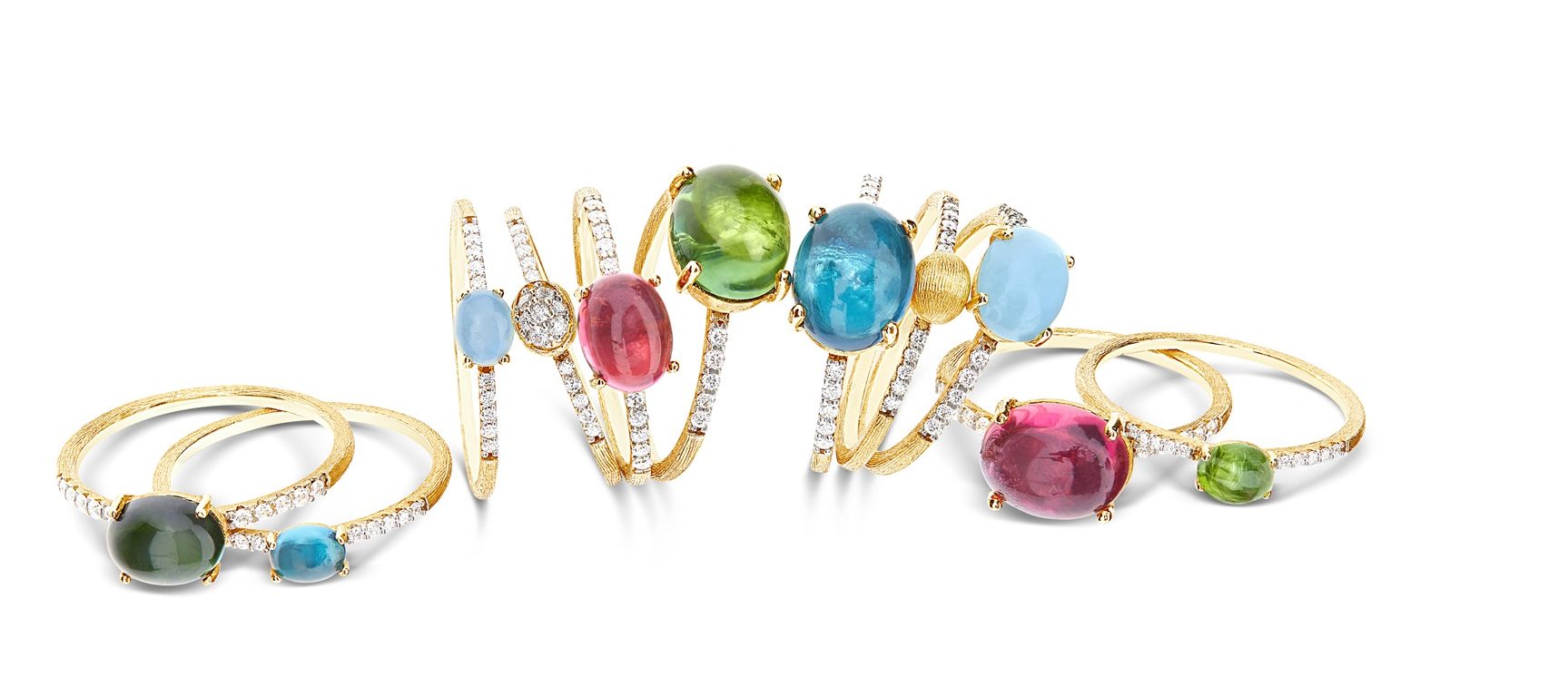 Dancing in the Rain. Tourmaline. Cмешанная коллекция дополнена сочетанием бриллиантов и бусин из 18-каратного золота, выгравированных вручную, с цветными турмалиновыми булями.
