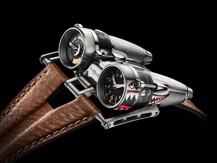 Левая турбина извещает обладателя часов о запасе хода с помощью резной стрелки, напоминающей по форме боевое оружие – излюбленный мотив MB&F. Правая турбина служит индикатором часов и минут, крупные стрелки покрыты составом Super-LumiNova. Стилизованный под приборную панель самолета, каждый из циферблатов регулируется собственной заводной коронкой. Одна из них позволяет завести «Часовую Машину» и пополнить запас топлива в баках, другая служит для установки времени. Таким образом, часы мгновенно извещают своего обладателя о результате выполненного действия.