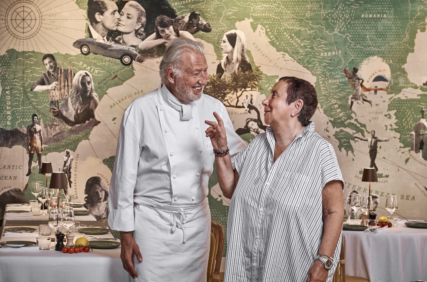 Будучи настоящими гурманами, дизайнеры с энтузиазмом взялись за интерьеры будущего Paradiso Nicole & Pierre. По их задумке пространство внутри ресторана, на террасе и вдоль бассейна отеля получилось элегантным, но в то же время расслабленным с истинно средиземноморской атмосферой. Основой цветовой палитры в оформлении интерьеров стали оттенки знаковых ингредиентов итальянской кухни: оливок, каперсов, шалфея, сицилийских лимонов и апельсинов. В качестве материалов использовали керамику, бежевый камень, ротанг, бархат и шелк. Оранжевые люстры из переработанного пластика были изготовлены эксклюзивно для ресторана. Оформление стен воспроизводит карту средиземноморского региона с отметками мест, где когда-либо происходили съемки фильмов – своеобразное напоминание о тесной связи отеля Le Majestic Cannes и мира кинематографа.