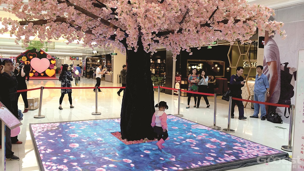 В основе решения лежат светодиодные технологии. В середине зала размещен интерактивный напольный экран площадью 64 кв. м. По своей сути это “живой пол” с яркими сюжетами, рождаемыми компьютерной системой. Аналогичные LED-экраны находятся на балконах, и все это вместе создает эффектную композицию. Красивая мозаика, прозрачное море с камешками, интерактивные игры. И взрослые, и дети любуются на это чудо, улыбаются, охотно играют и фотографируются.
