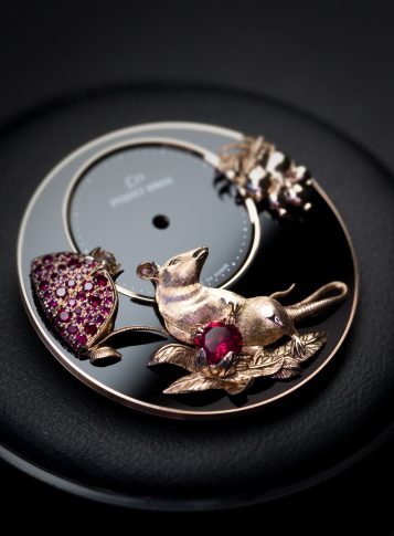 Изображения Крысы и Граната украшают все четыре эксклюзивные модели Jaquet Droz. Они ярко свидетельствуют о высокой квалификации специалистов Художественных мастерских, которым удалось создать исключительно натуралистические сцены в лучших традициях Дома. На двух первых моделях (Petite Heure Minute 35 mm и Petite Heure Minute 39 mm) с циферблатами в технике горячей эмали изображены две Крысы на ложе из листьев, тут и там усыпанном гранатами. Обе версии изготовлены из розового золота. Корпус и ушки часов Petite Heure Minute 35 mm полностью инкрустированы бриллиантами. С обратной стороны каждая модель, выпущенная ограниченной серией из 28 экземпляров, оснащена специально разработанным ротором. Он оформлен гравировкой, выполненной на розовом золоте. Сцена, где еще две Крысы наслаждаются корзиной гранатов, представляет собой метафору процветания, изобилия и предприимчивости.