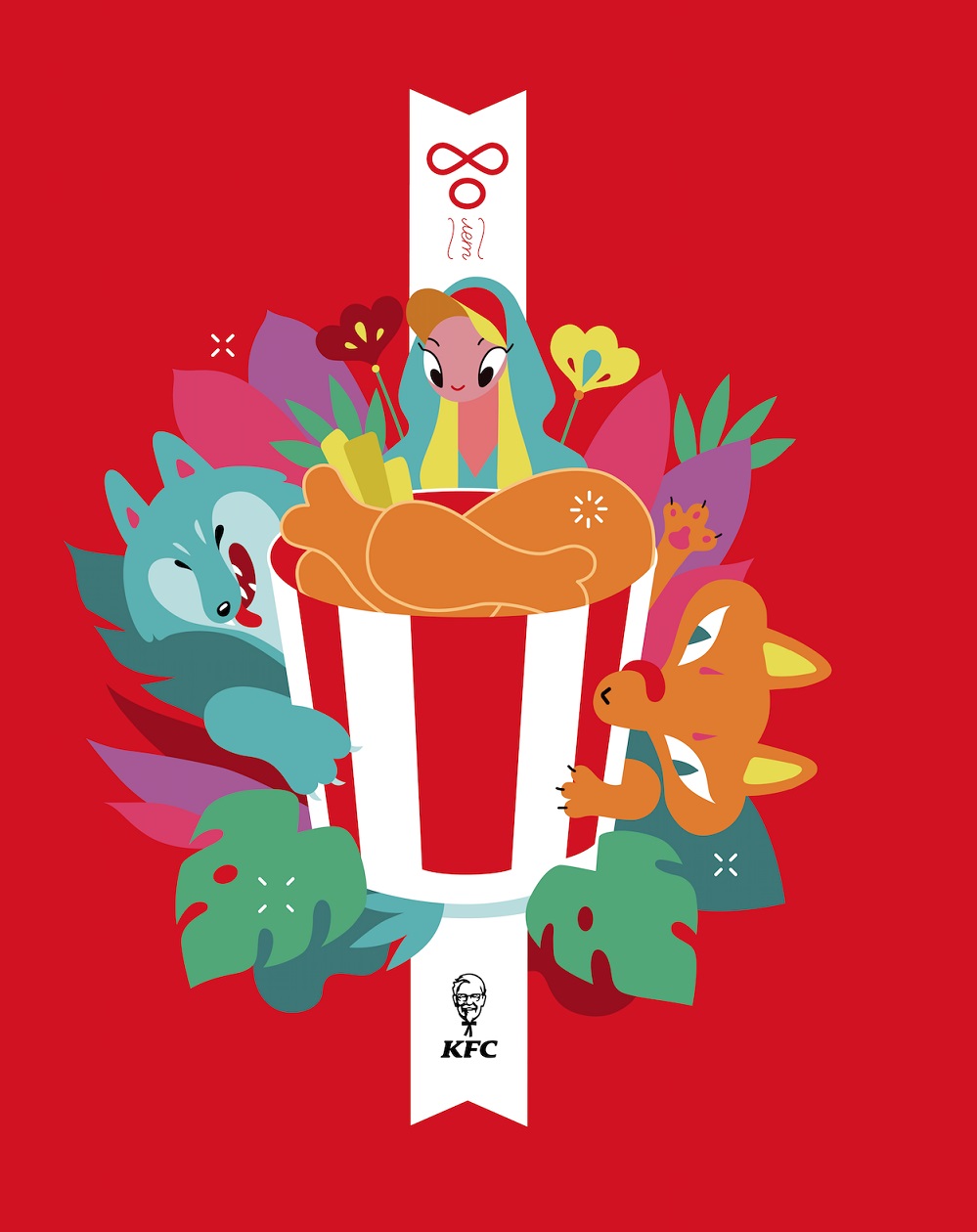 “В честь юбилея – 80 лет особому рецепту крылышек KFC – мне предложили сделать иллюстрацию для худи. Для любителей курицы – это очень знаковый вкус, и, поговорив с моими друзьями, я поняла: они так любят его, что, приходя в KFC, чувствуют себя хищниками на охоте. Поэтому я нарисовала обычную девочку, которая конкурирует за баскет с голодными лисой и волком” – говорит Антония Лев, иллюстраторка и уличная художница.