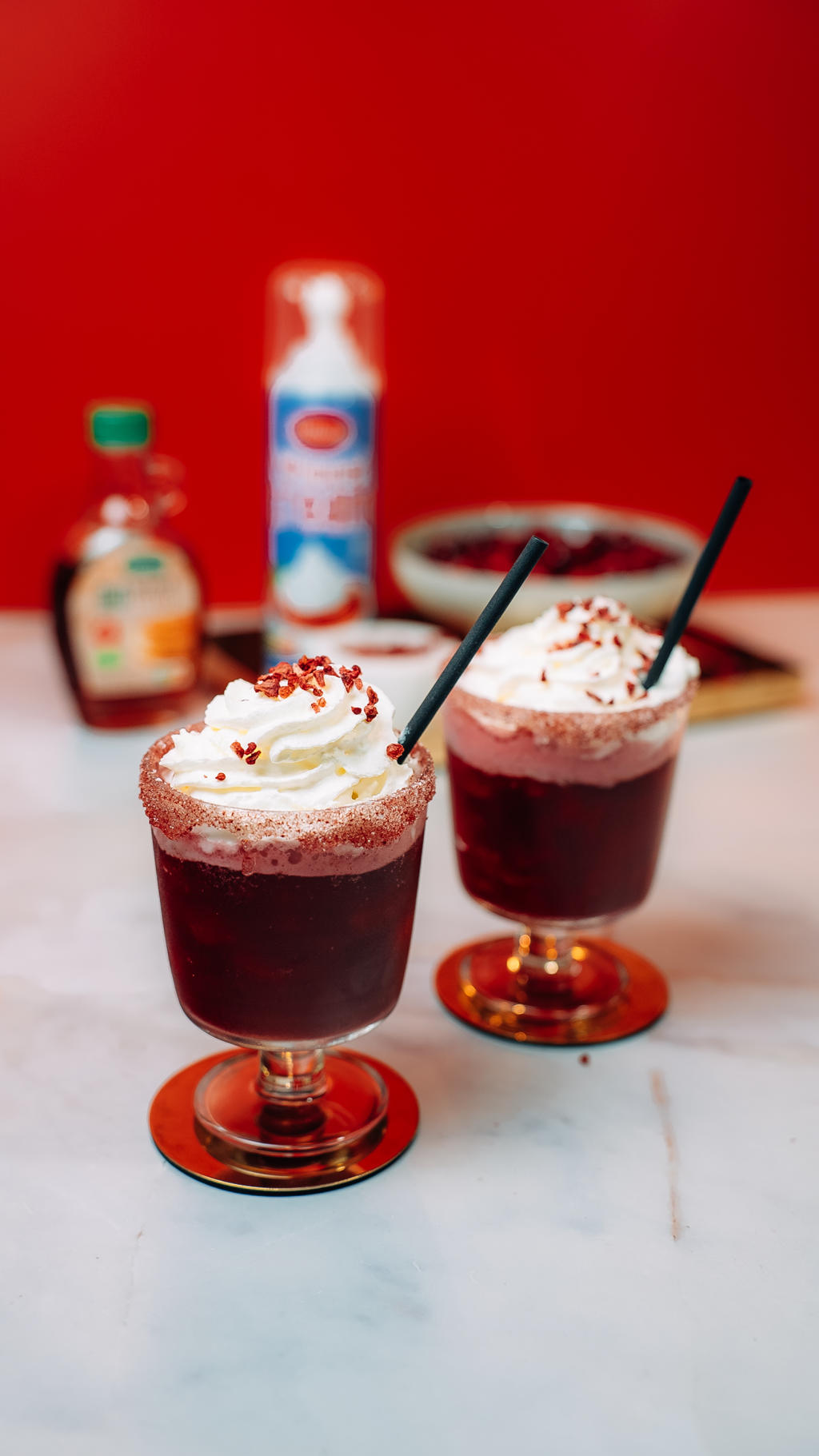 Приготовление: края бокалов обмакнуть в сироп и ягодную крошку. В шейкере смешать сок, сироп, специи и лёд, взболтать. Разлить по бокалам, сверху добавить взбитые сливки и ягоды.
