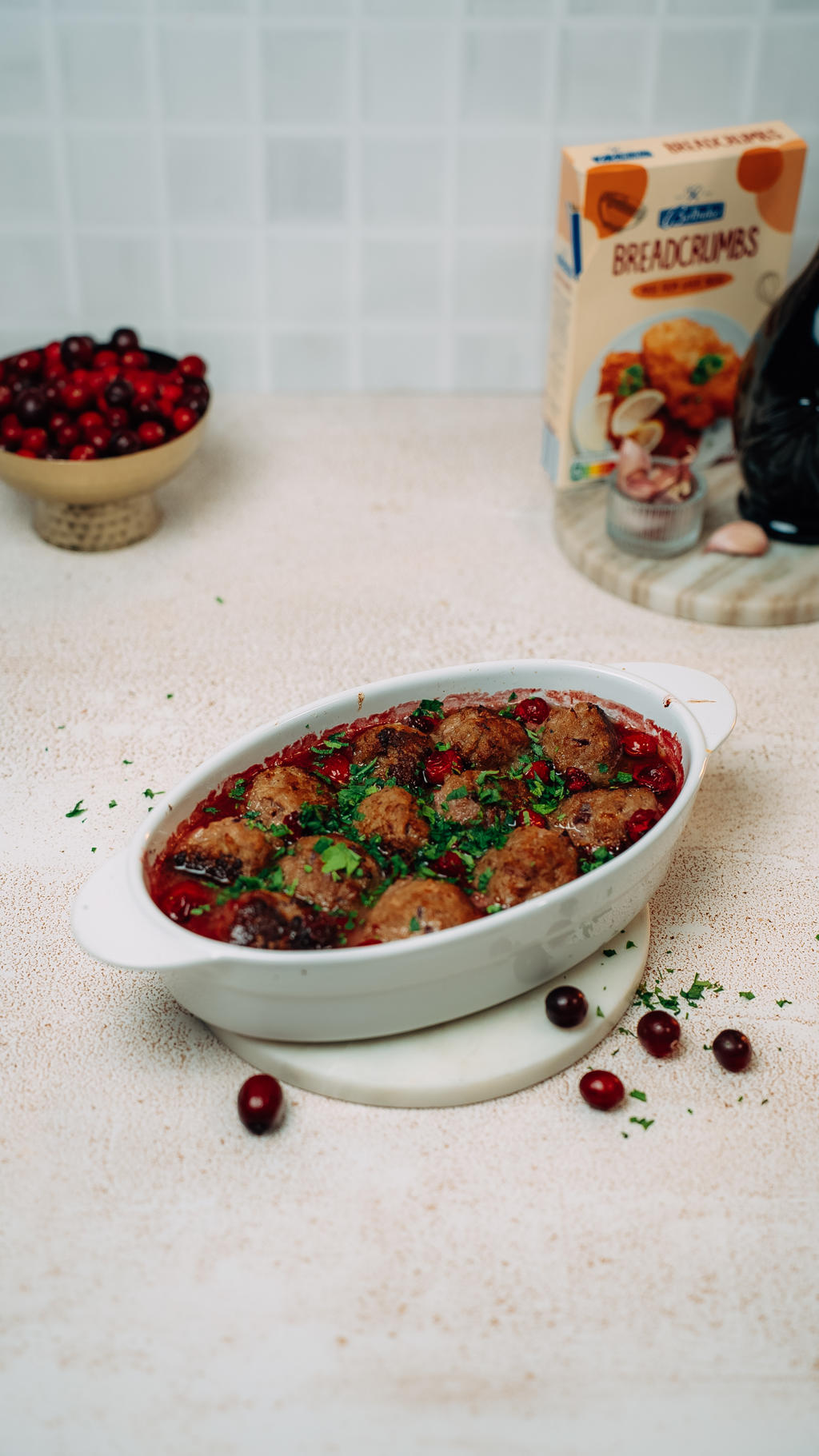 Ингредиенты: 500 г смешанного фарша, 50 г панировочных сухарей, 1 яйцо, 2 ст. ложки майонеза, соль и перец по вкусу, 1 красная луковица (половина в фарш, половина в соус), 2 зубчика чеснока, 200 г клюквы, 1 ст. ложка горчицы, 2 ст. ложки коричневого сахара, 2 ст. ложки масла, 100 мл воды, 1 ст. ложка соевого соуса.
