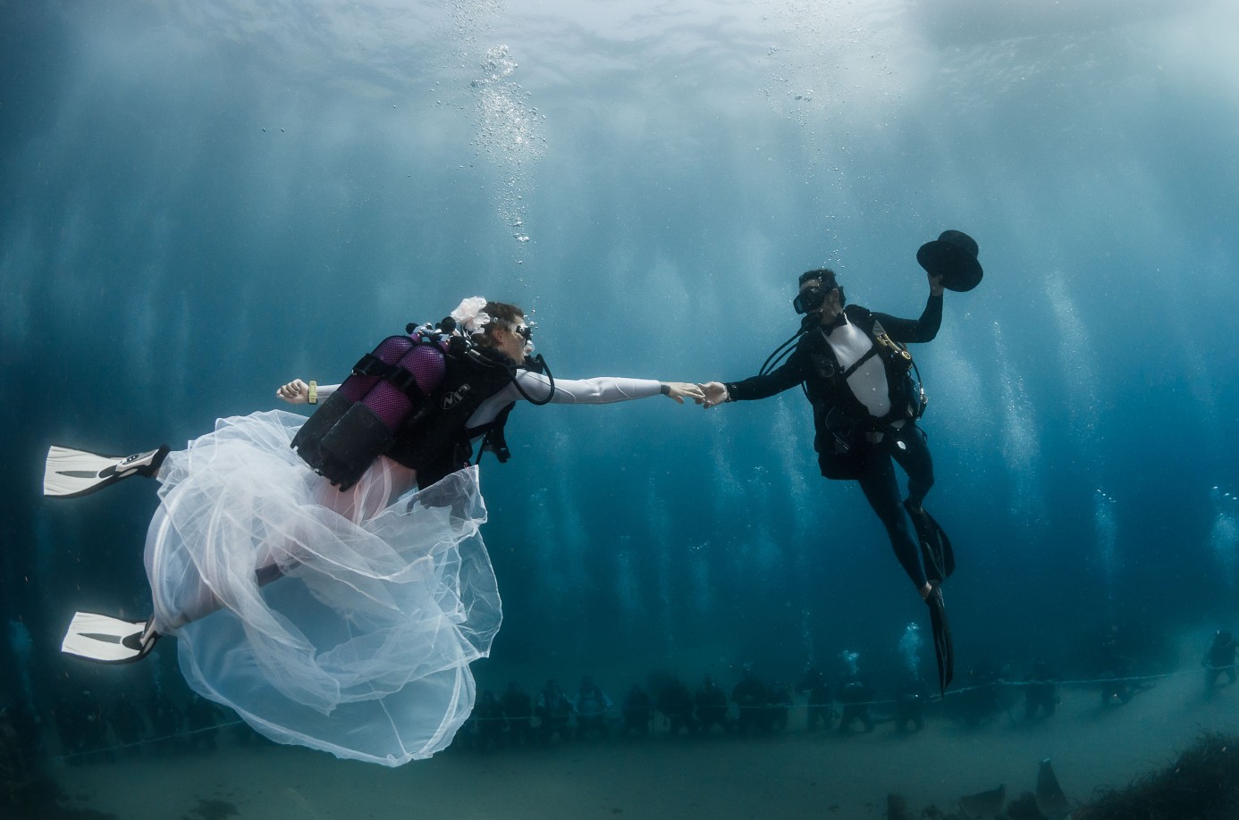 Влюбленные, так же как и гости церемонии, были снабжены всем необходимым подводным снаряжением, кроме того, церемонию сопровождали дипломированные инструкторы подводного плаванья.