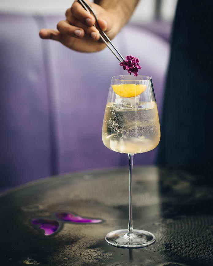 Следующий раздел – «Праздник» – это именно то, чего нам так не хватало весь прошлый год. В изысканной коллекции напитков бал правит шампанское. «Вишенка на торте» – коктейль, вдохновленный кондитерским искусством, ведь без торта праздник будет неполным. В этом роскошном напитке доминируют вкусы вишни и фисташки, в его состав входят Everleaf Mountain (безалкогольный аперитив, который представляет собой смесь из 12 экологически чистых ингредиентов от клубники до соцветий вишни), ликеры из вишни и фисташек, а также игристая комбуча на лепестках роз. «Порадуй себя 2.0» – именины души из клубники и сливок. Клубника и сливки подавались на королевских банкетах еще в XVI веке по особому случаю в аккомпанементе с шампанским. Напиток включает водку Grey Goose, клубнику, клубничный молочный пунш и шампанское Taittinger Rosé.