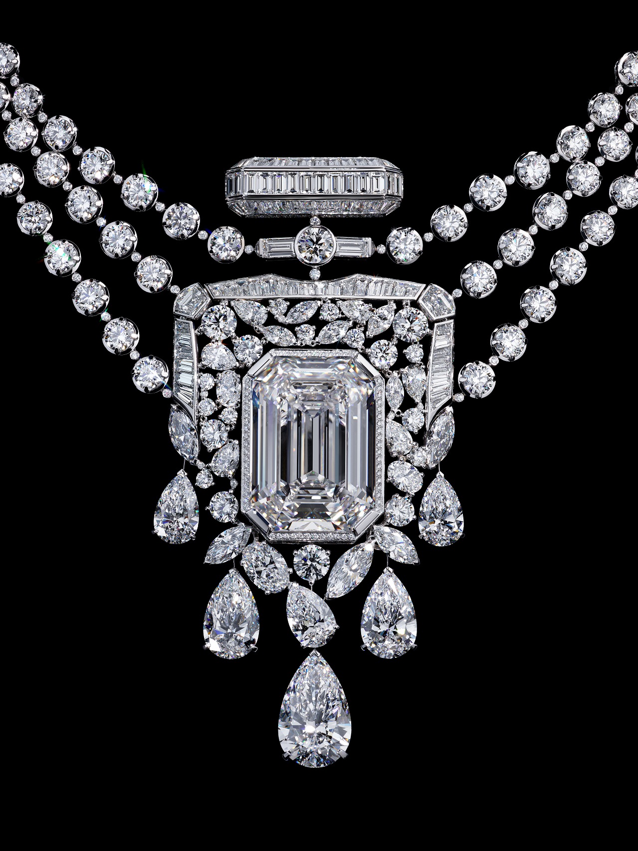 Силуэт пробки, абрис флакона, застежка в форме счастливого числа и каскад грушевидных бриллиантов разного размера – вот из чего состоит уникальное колье, настоящая ода аромату N°5. Фигуративности здесь не меньше, чем абстракции, а результат куда значительнее обычной стилистической игры: колье 55,55 – это сопряжение легенды аромата N°5 с легендами ювелирного искусства, новая ступень ювелирного мастерства и новый эпизод в истории самого первого аромата CHANEL.