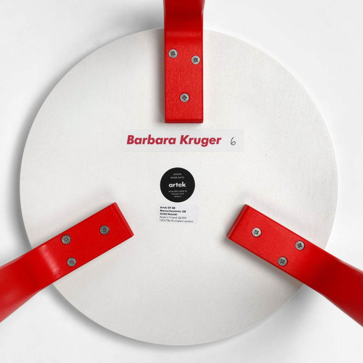 Мебельный бренд Artek объединился с Институтом Современного Искусства ICA (Лондон), и результатом этой коллаборации стал проект Untitled (Kiss) (2019). В рамках проекта американская концептуальная художница и дизайнер Барбара Крюгер переосмыслила разработанный Алваром Аалто табурет Stool 60. Крюгер достигла международного признания благодаря своим фотографиям и словам. В своих работах, среди которых есть как фотоколлажи и инсталляции, так и многоканальные видео, художница исследует вопросы власти, гендера, идентичности и ценности. Untitled (Kiss) станет основой долгой коллаборации Artek и ICA, для которой различные художники переосмыслят облик иконического табурета Stool 60.