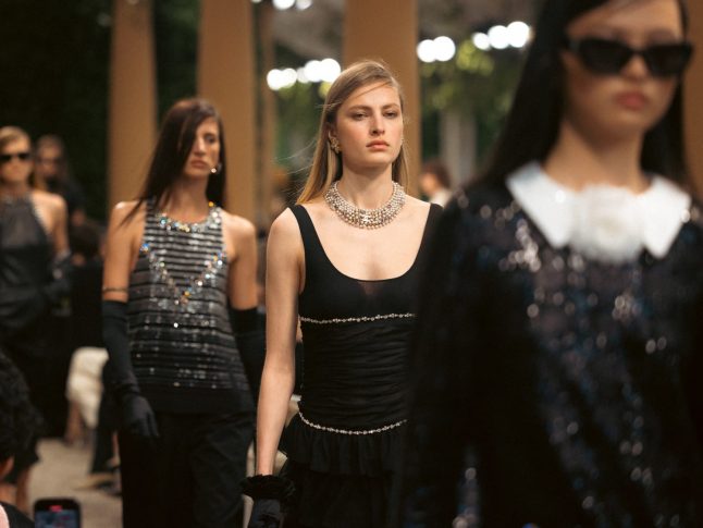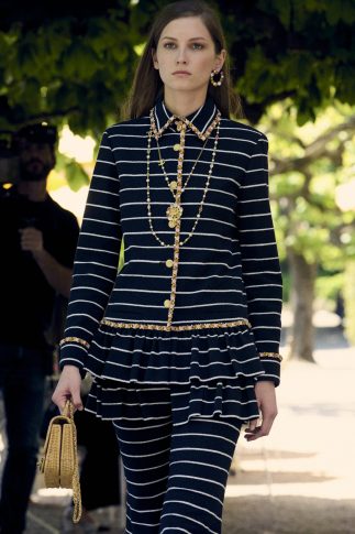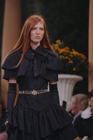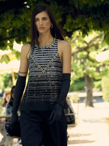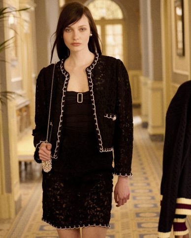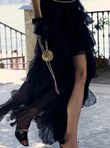 На ум приходят долгие тёплые вечера – чёрное платье-бюстье из тафты сопровождается воздушным кейпом, а вышивка из бисера и страз на блузе из слоновой кости подчёркивает белоснежные вечерние брюки. Неуловимое кинонастроение витает в образах, навеянных эстетикой Лукино Висконти – друга мадемуазель Шанель и завсегдатая озера Комо.
