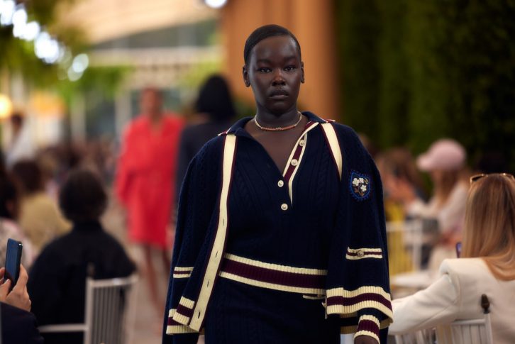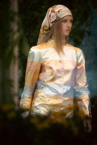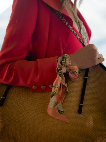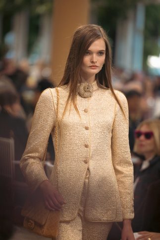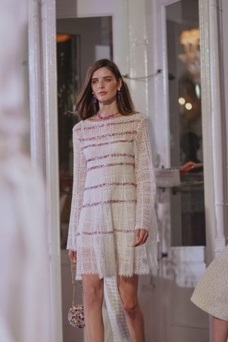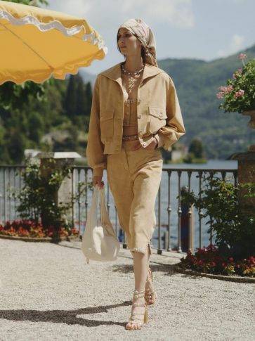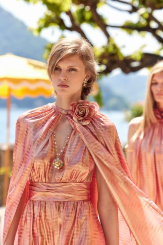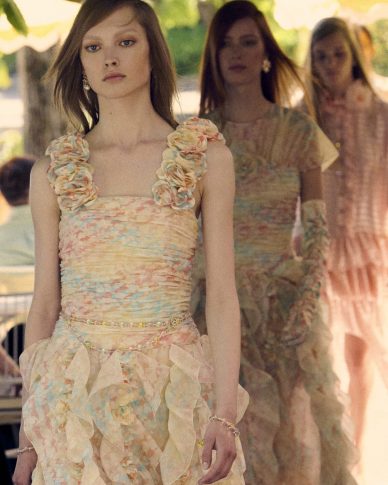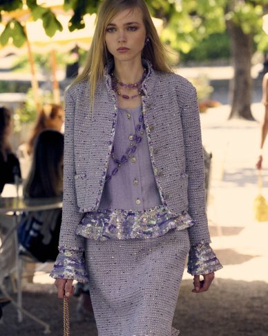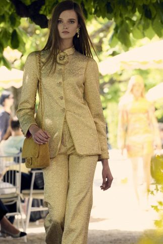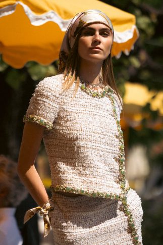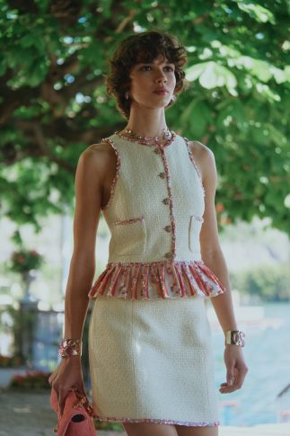 Словно лёгкое дыхание летнего дня, коллекция сочетает игривость и элегантность. Платья из воздушного тафты в оттенках персика, розового и небесно-голубого отражают спокойствие озера, а твидовые костюмы в солнечной палитре – охра, жёлтый, апельсиновый – перекликаются с архитектурой Виллы. Знаковый фильм-тизер Софии Копполы придаёт показу атмосферу мечты и света.